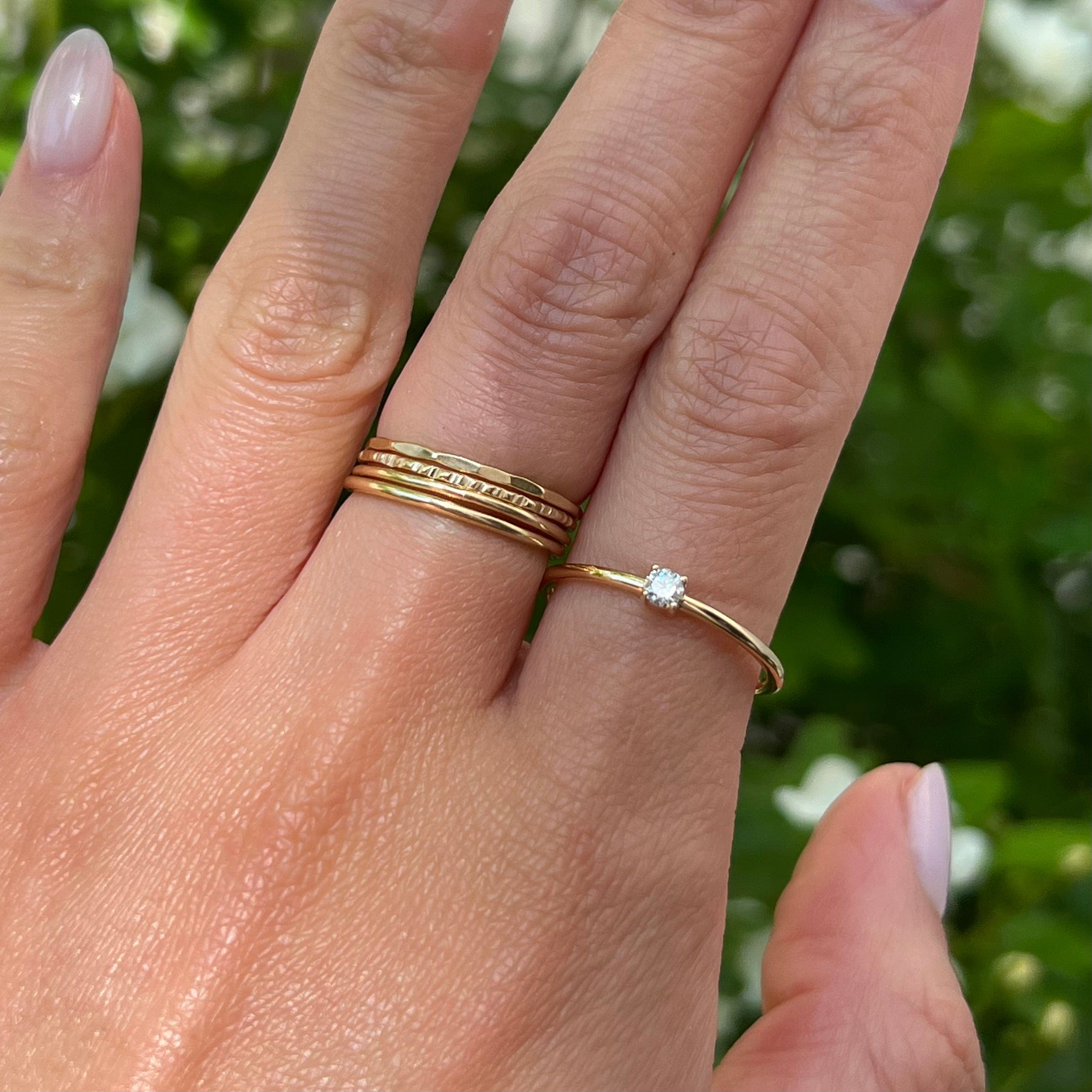 A versatile piece of jewelry featuring a round, brilliant-cut diamond set on a band designed to be easily stacked with other rings for a customizable and elegant look.