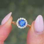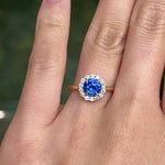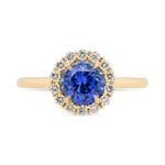 This ring features a 1.2ct vibrant blue sapphire surrounded by a radiant halo of sparkling diamonds. Set in warm yellow gold, the design perfectly balances bold color with timeless elegance. The sapphire’s rich hue draws the eye, while the diamond halo adds light and brilliance. Perfect for someone who loves a classic design with a vibrant twist.
