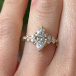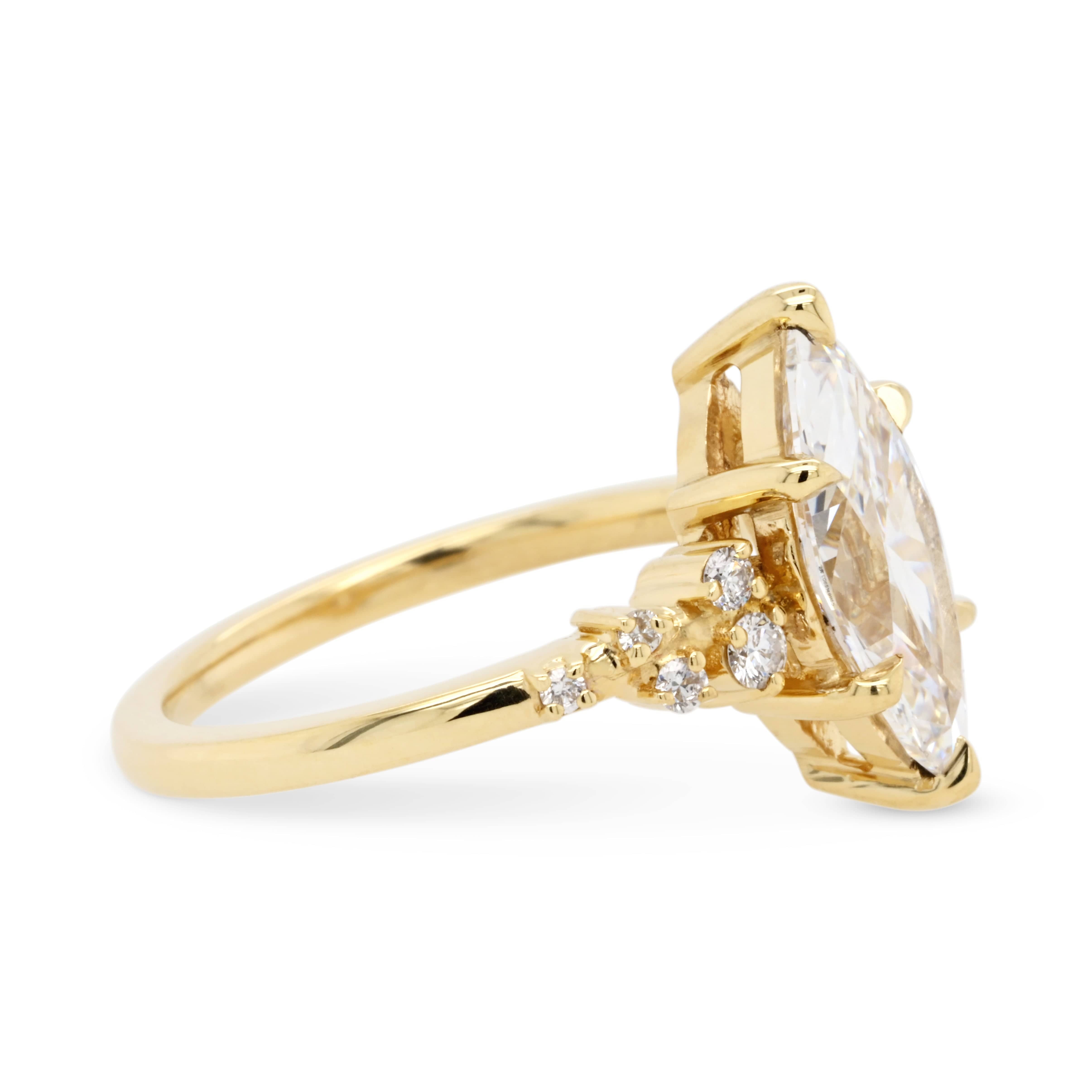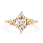 This breathtaking engagement ring showcases a brilliant marquise-cut diamond, its elongated shape maximizing sparkle and elegance. Nestled in warm yellow gold, a delicate cluster of accent diamonds cascades down the band, enhancing its celestial shimmer. A perfect choice for those drawn to vintage-inspired silhouettes with a bold, modern edge.