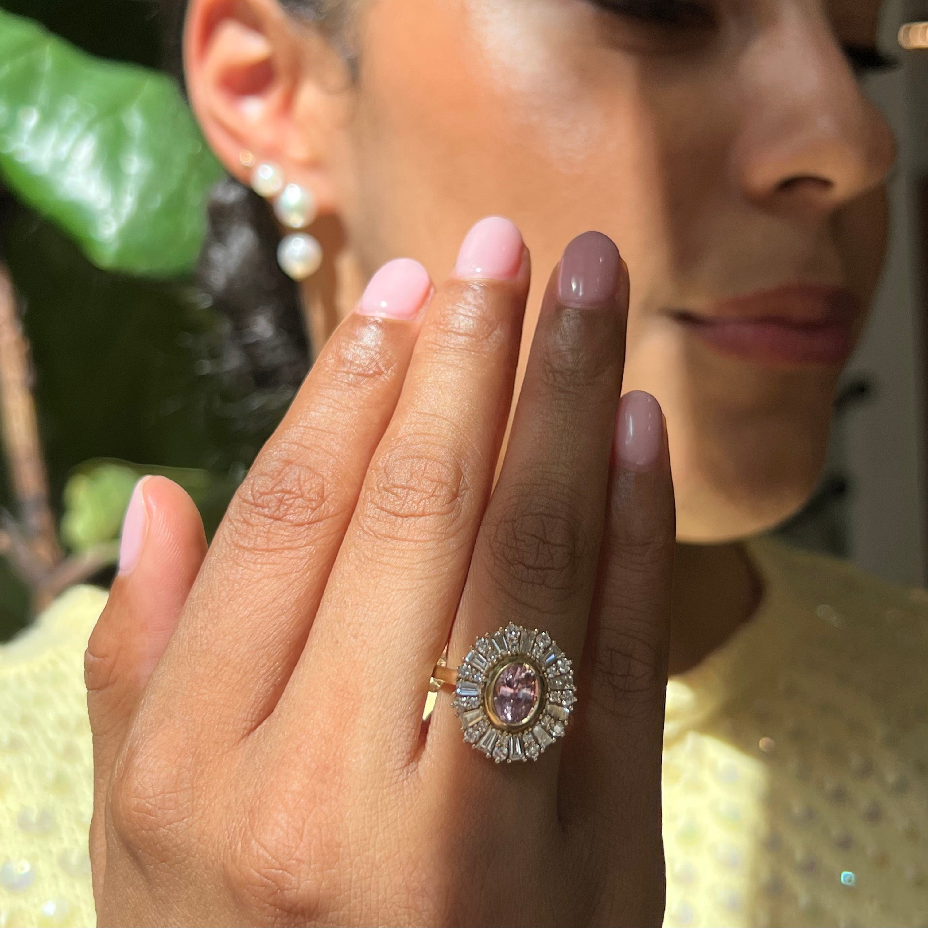Truly one-of-a-kind, this ring has vintage vibes mixed with a coveted perimeter of diamonds to enhance this dimensional pink sapphire. This can be worn on your left hand as a stand-out engagement ring, or your right as a bold cocktail ring for special occasions.