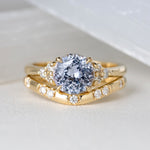 A smoky light blue round sapphire is the focal point of this design, framed by classic diamond accents. Elegant and refined, with a cool touch of color.