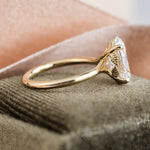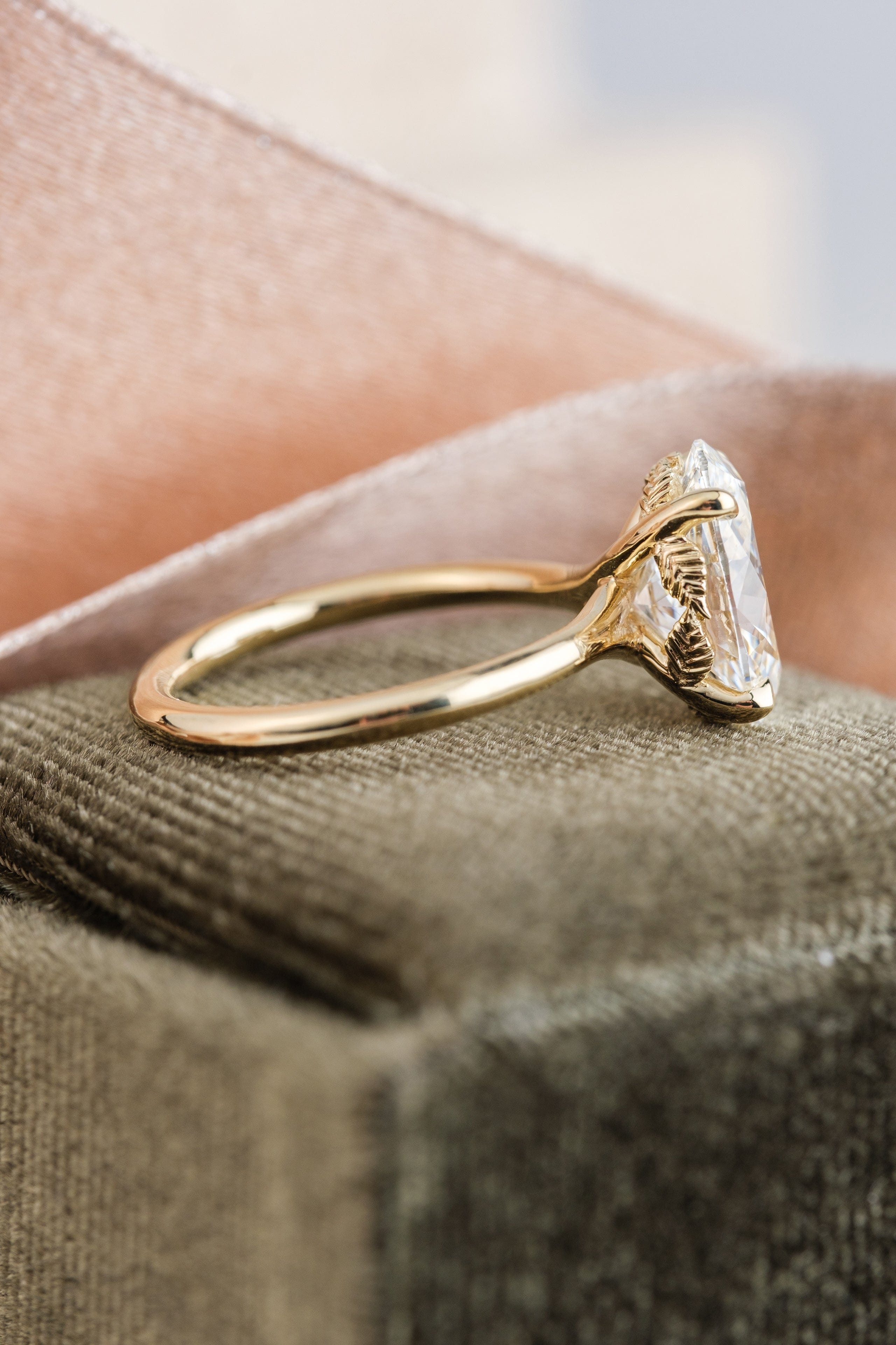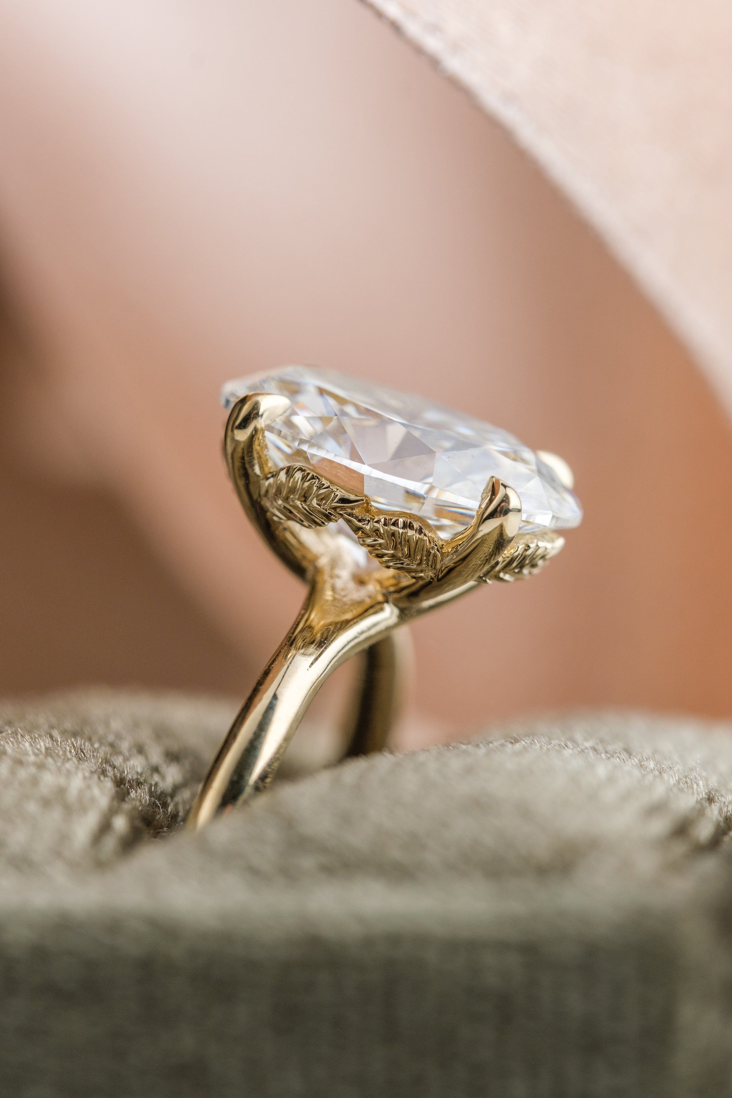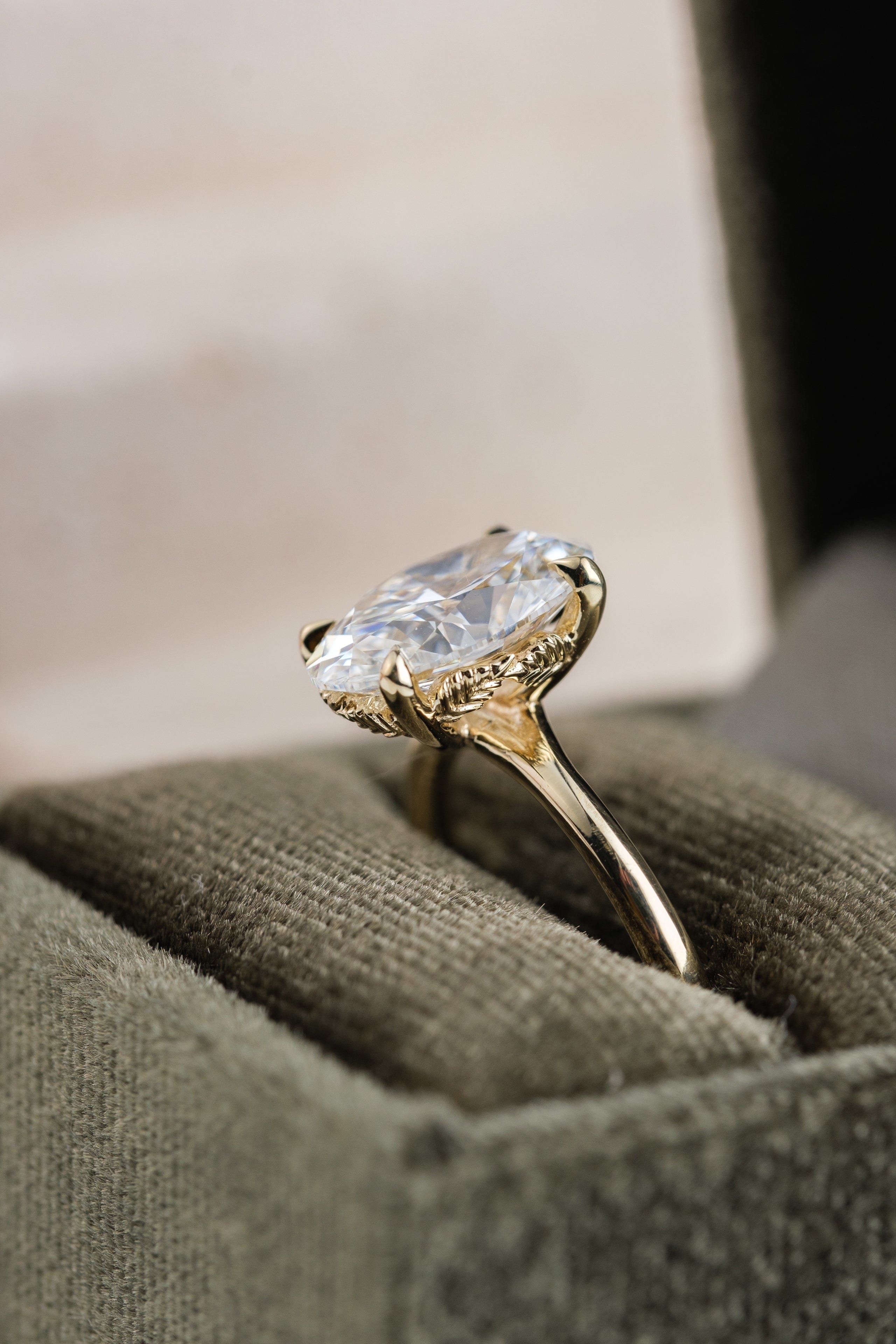 A tribute to nature’s elegance, the Flora setting is a delicate yet striking engagement ring that embraces organic beauty. At its heart, a breathtaking 2.27ct oval diamond captures the light from every angle, radiating brilliance with each movement. The band, crafted in warm gold, is adorned with intricately carved leaf accents, a subtle nod to the beauty of botanical forms. These fine details add a touch of old-world craftsmanship, making this ring feel both timeless and deeply personal. Designed for those who find inspiration in nature, the Flora setting is a symbol of growth, love, and enduring beauty.