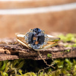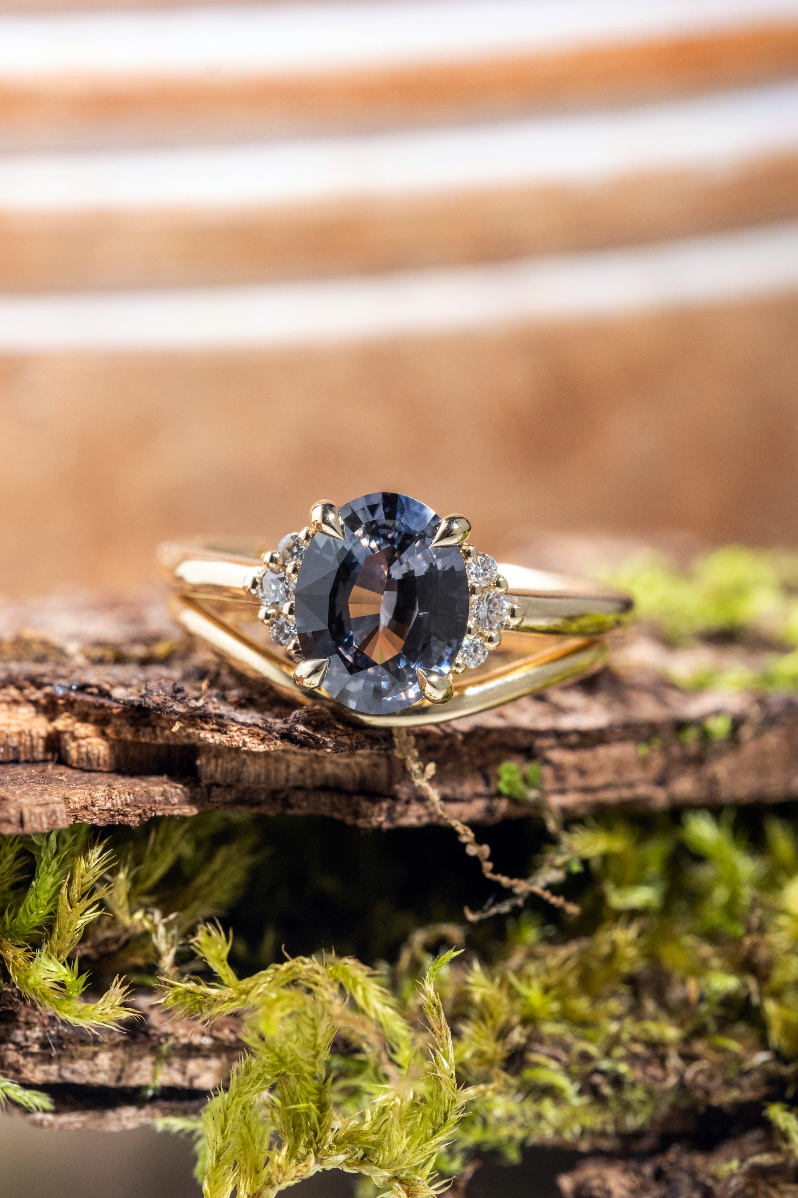 This warm yellow gold setting with bite-sized melee perfectly frame a blue gray oval sapphire. Timeless and modern for any wearer.