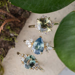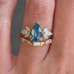 A pearly blue-green pear sapphire is the focal point of this design, framed by classic marquise diamond accents. Elegant and refined, with a cool touch of color.