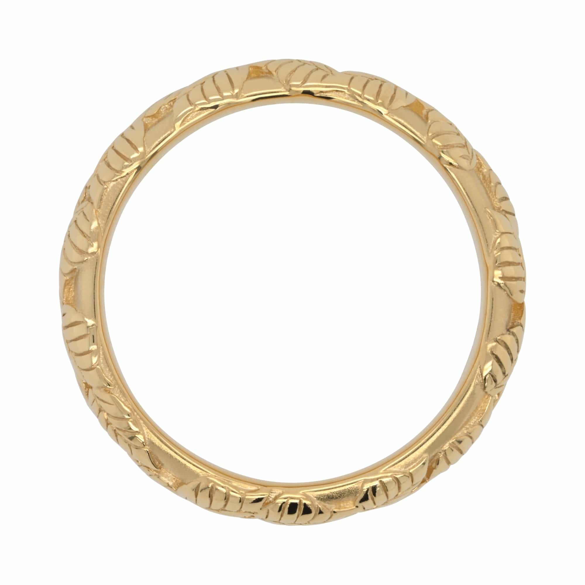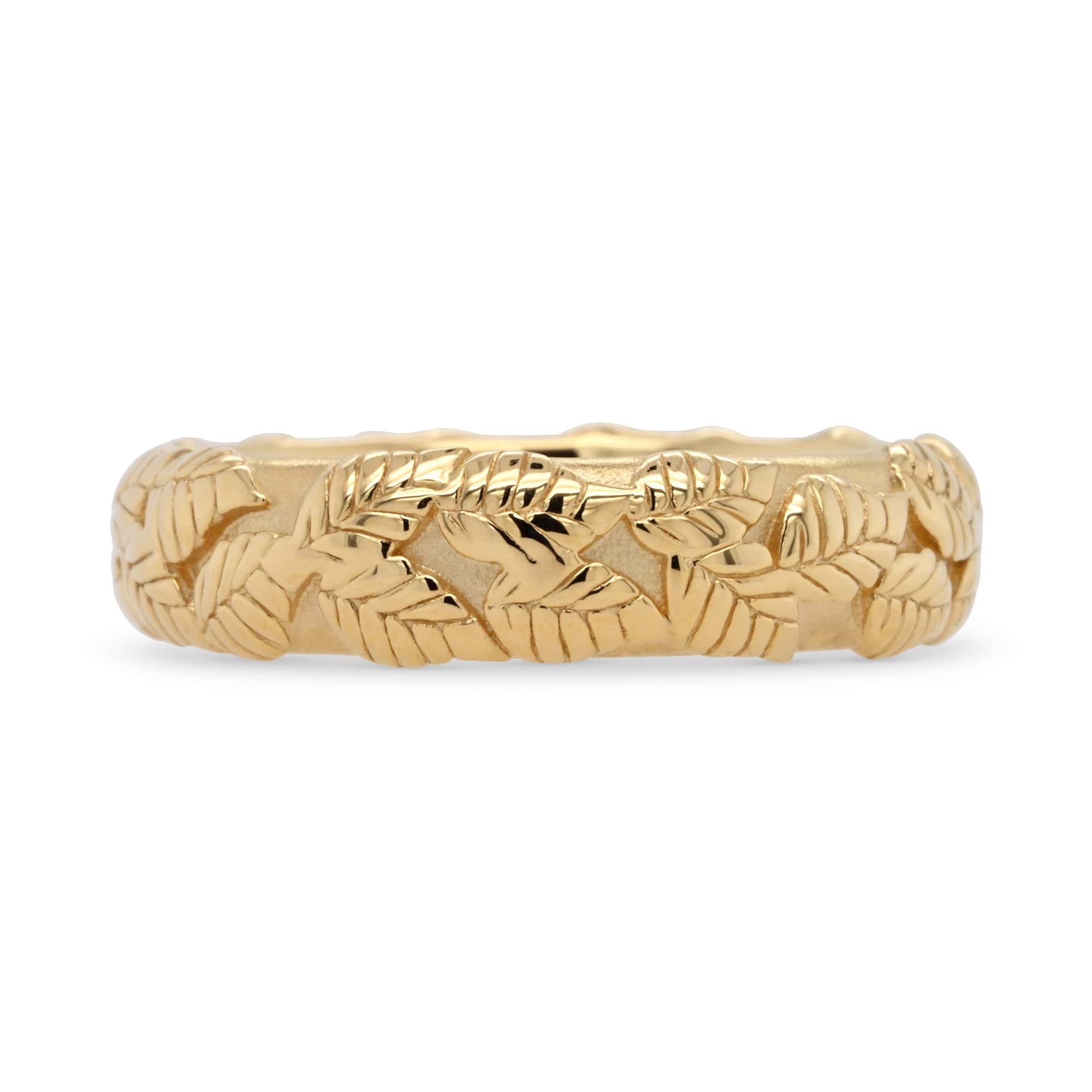 Inspired by nature’s quiet beauty, this 5mm gold wedding band features intricately carved leaf motifs wrapping around its entire circumference. A timeless tribute to growth, resilience, and enduring love, its organic texture catches the light with a warm, golden glow. Perfect for those drawn to botanical details and meaningful symbolism in their jewelry.