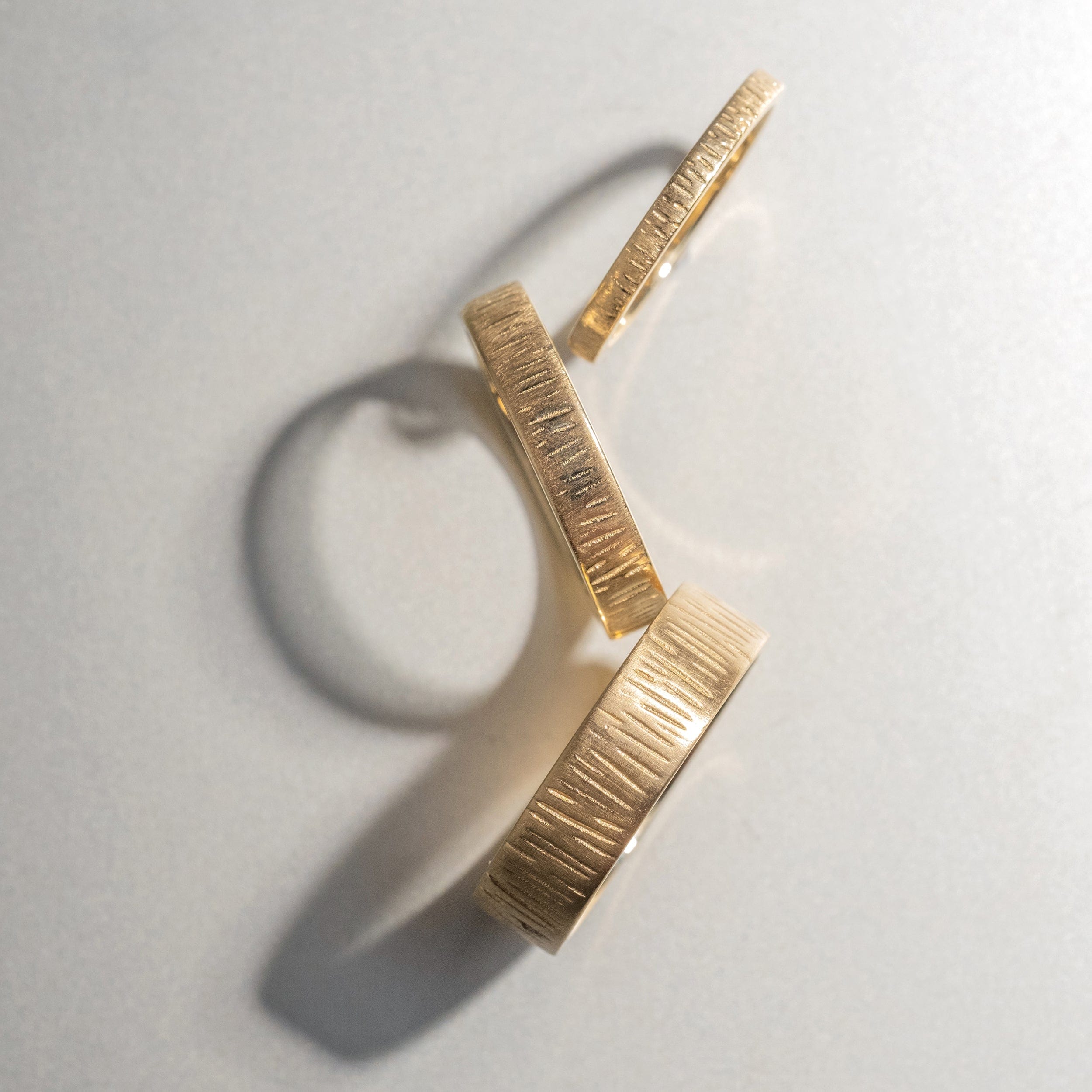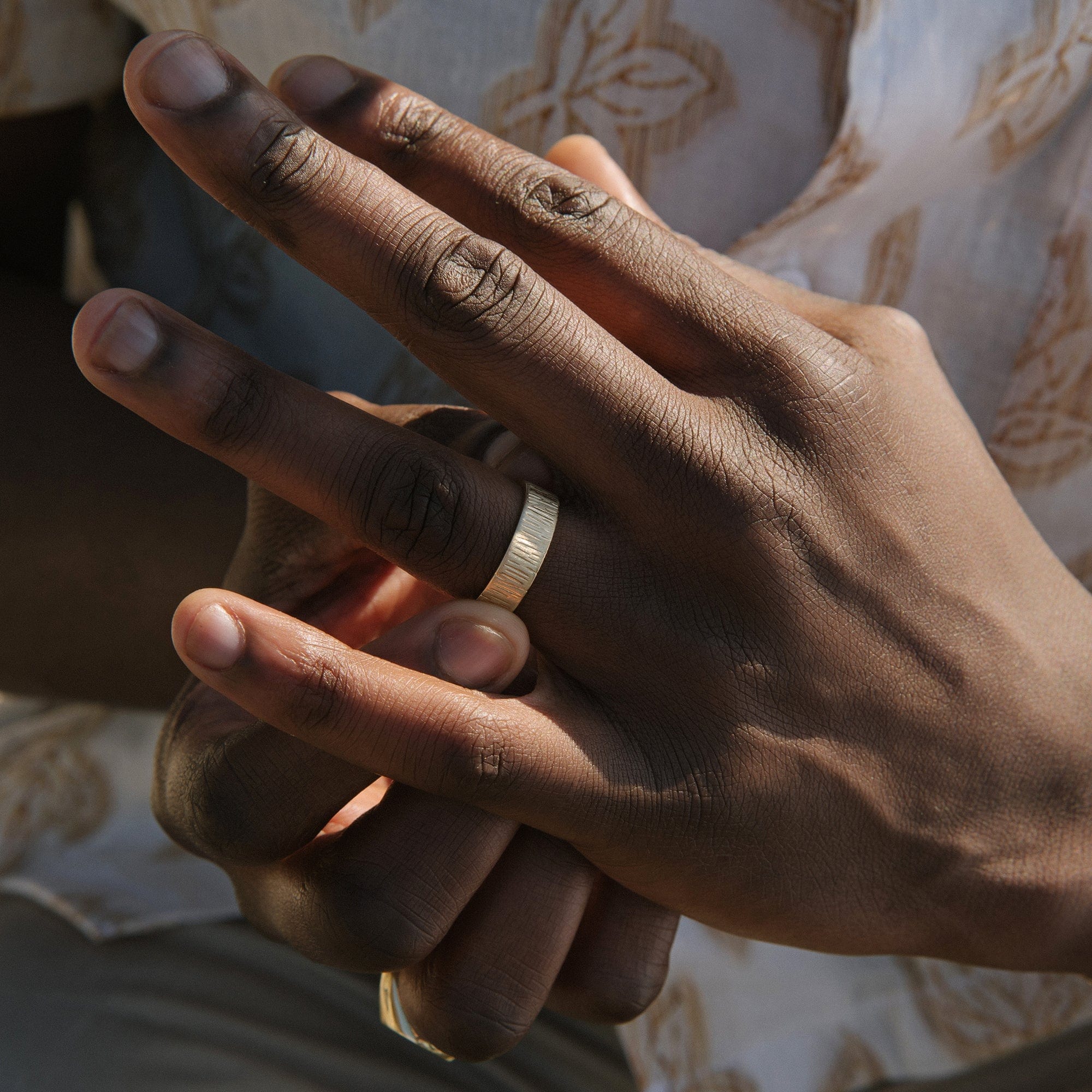 The Birch Wedding Band is perfect if you want to mix up your style with a little bit of forest-inspired texture. The linear strokes and woodgrain texture give this unisex wedding ring a unique rugged and organic feel.