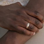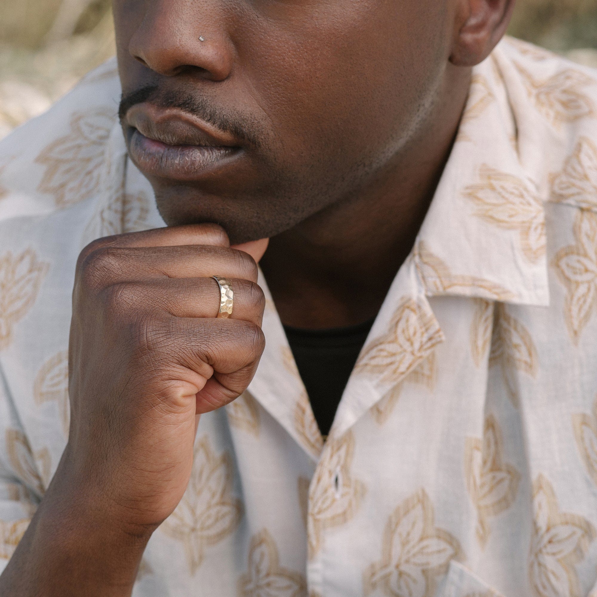 This rugged men’s wedding band features a distinctive hammered texture, offering a bold yet understated style. Crafted in solid gold, its unique finish highlights the organic detailing, giving it a timeless and masculine appeal. Perfect for the person who values durability and individuality, this band is as enduring as the commitment it represents.