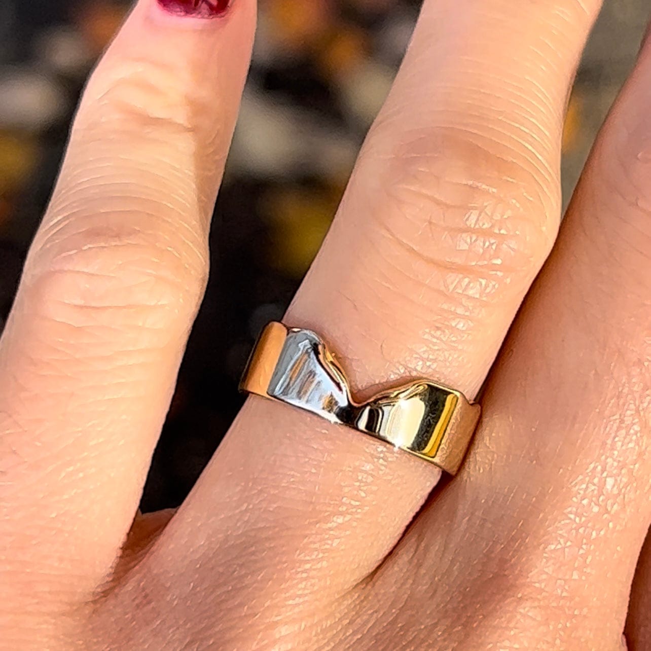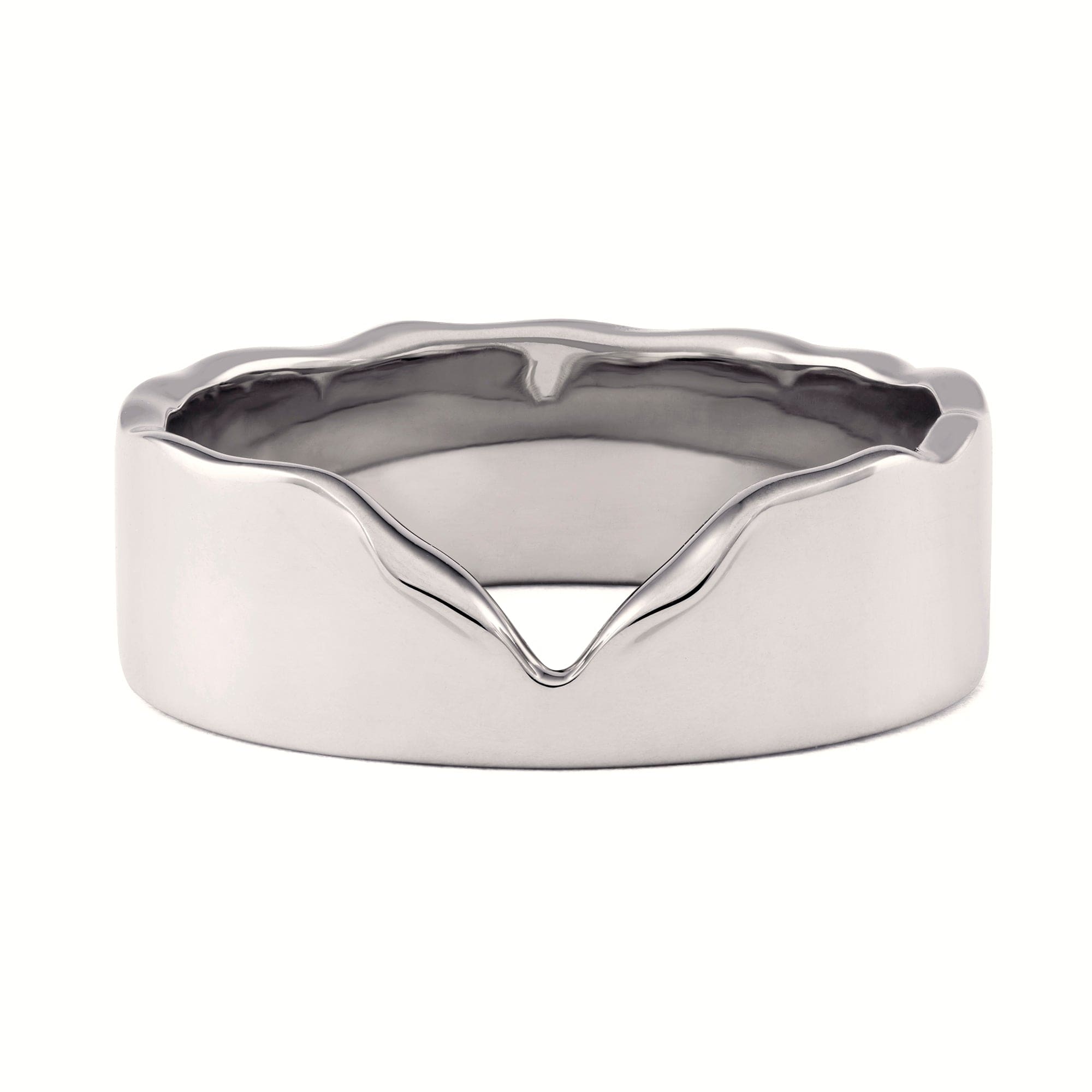 This unique piece draws its inspiration from nature's geological wonders, featuring a distinctive V-shaped cutout reminiscent of rugged rifts and formations. Crafted with precision and passion, this band is a testament to the beauty found in the Earth's natural architecture. This ring is made with a slight cut-out to perfectly hug your engagement ring. Looking for a thinner version? Check out our 4mm Rift Band