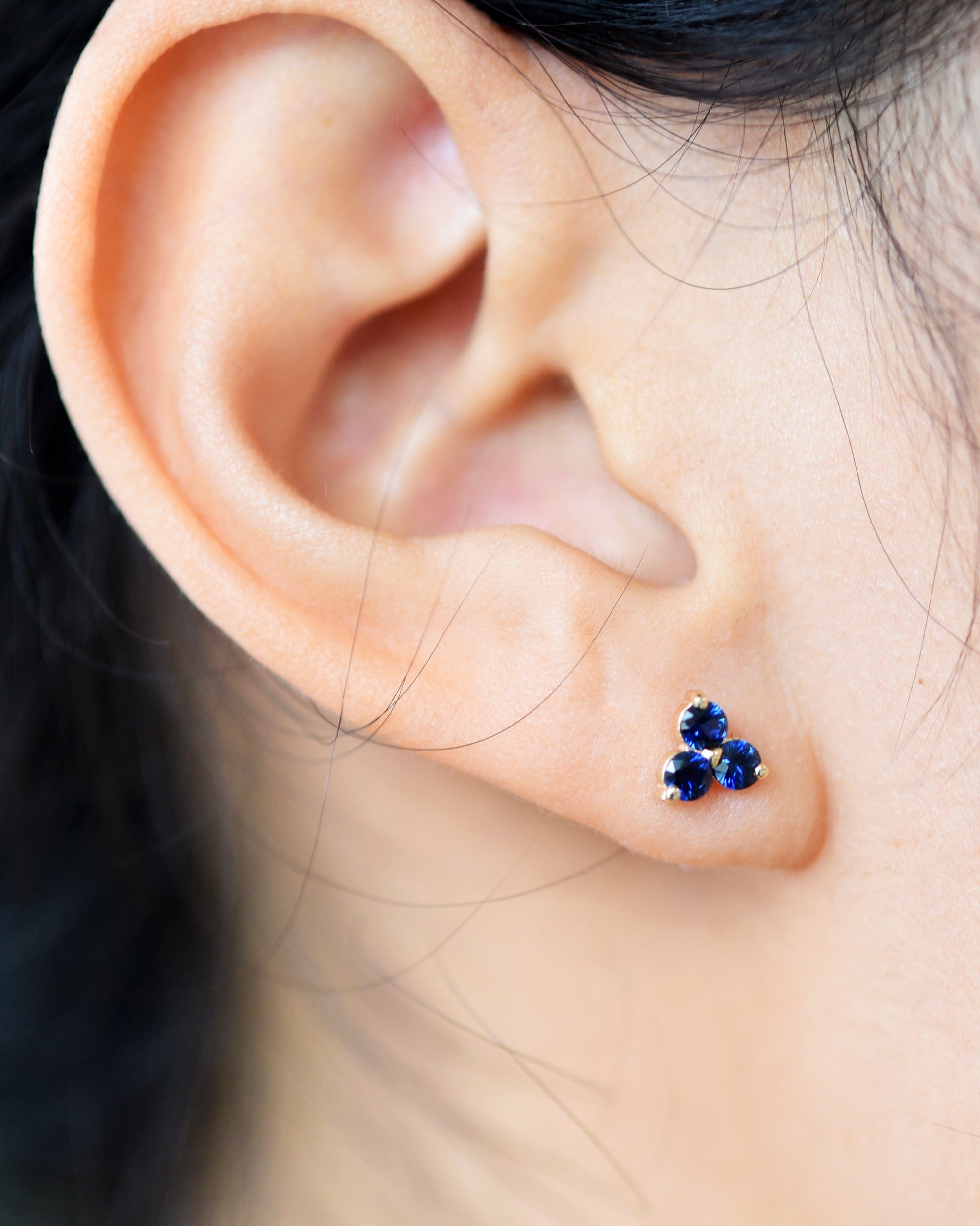 14k yellow gold stud earrings with 3 blue sapphires arranged in a floral shape