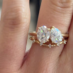 14k yellow gold Asscher-cut diamond and teal pear sapphire Toi et Moi ring, paired with a 14k yellow gold diamond contour band