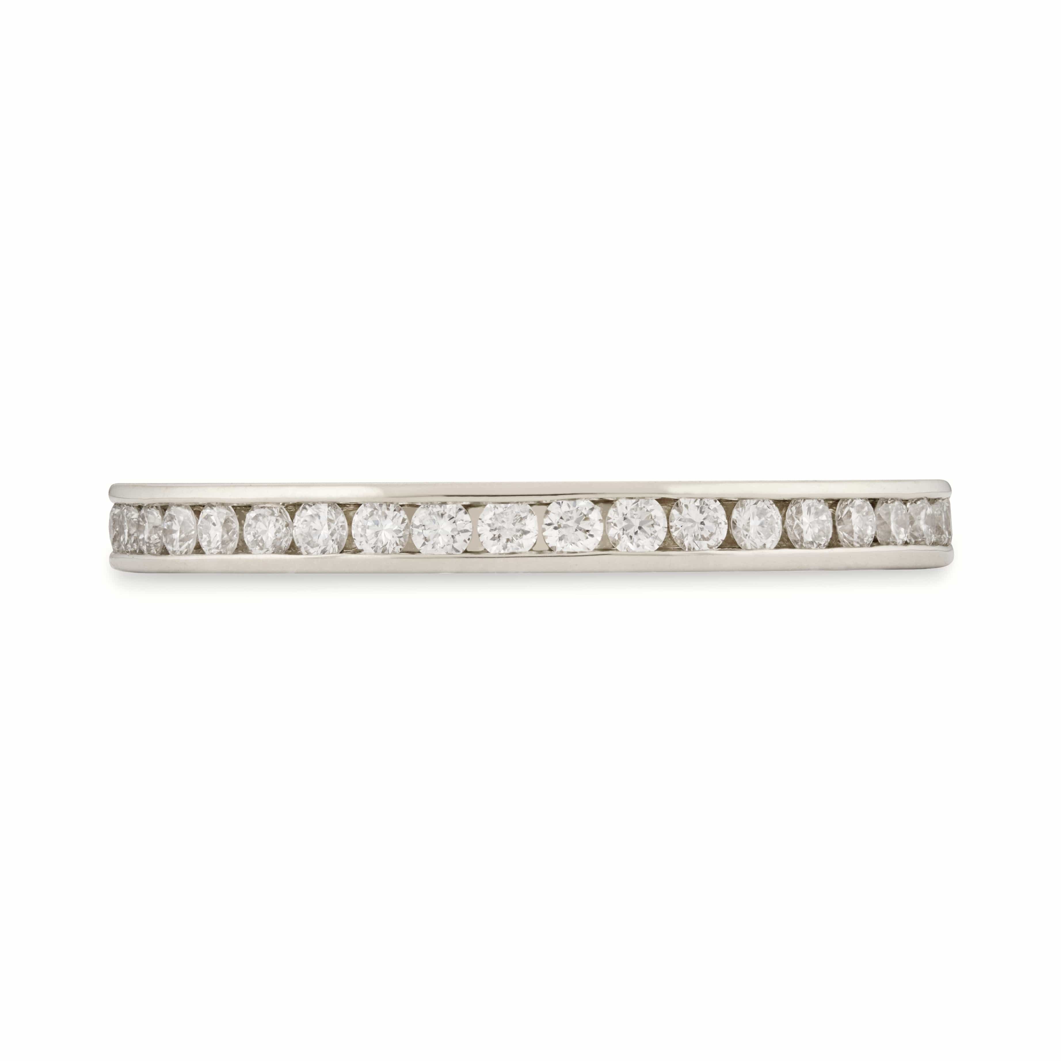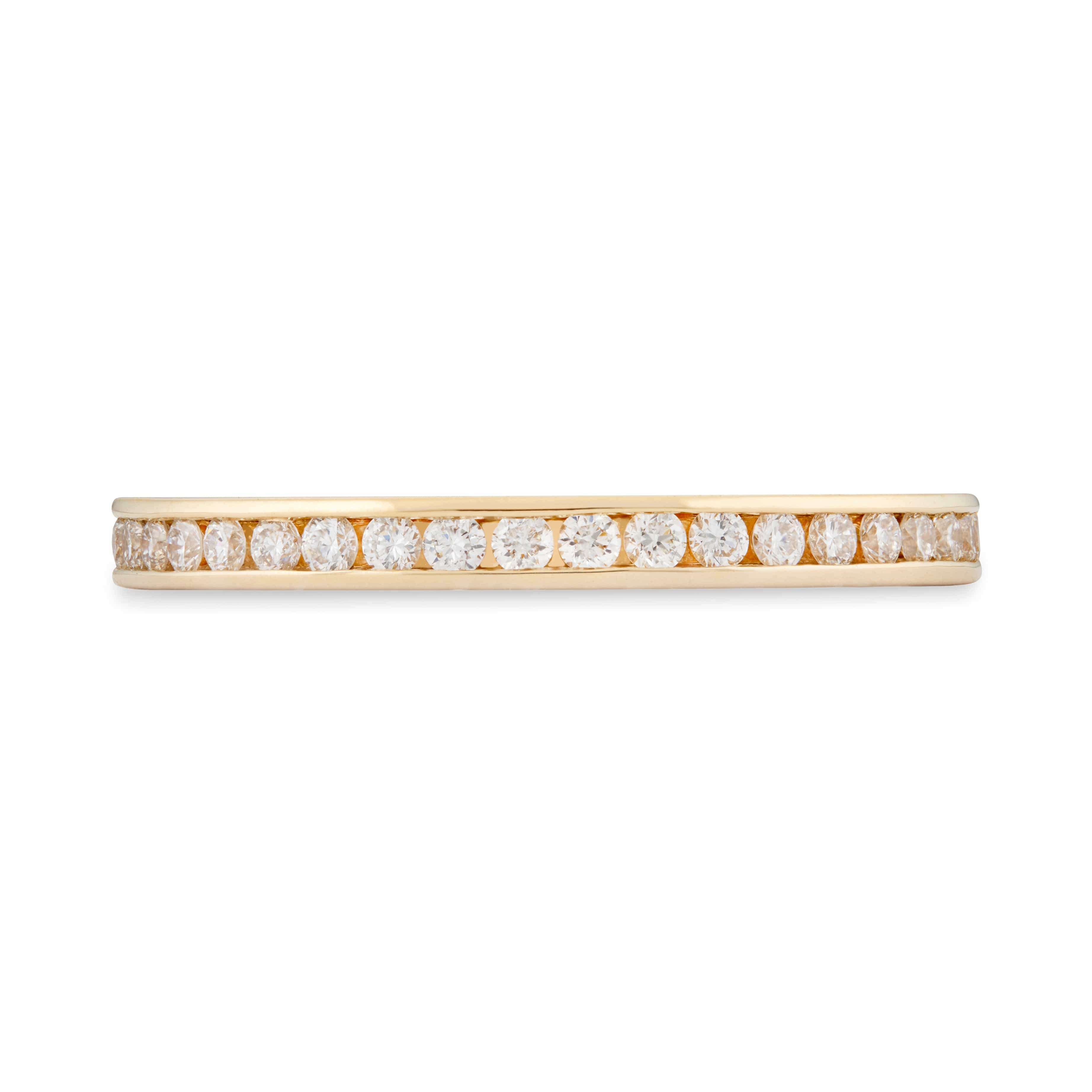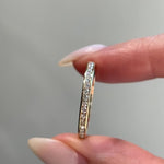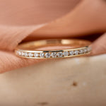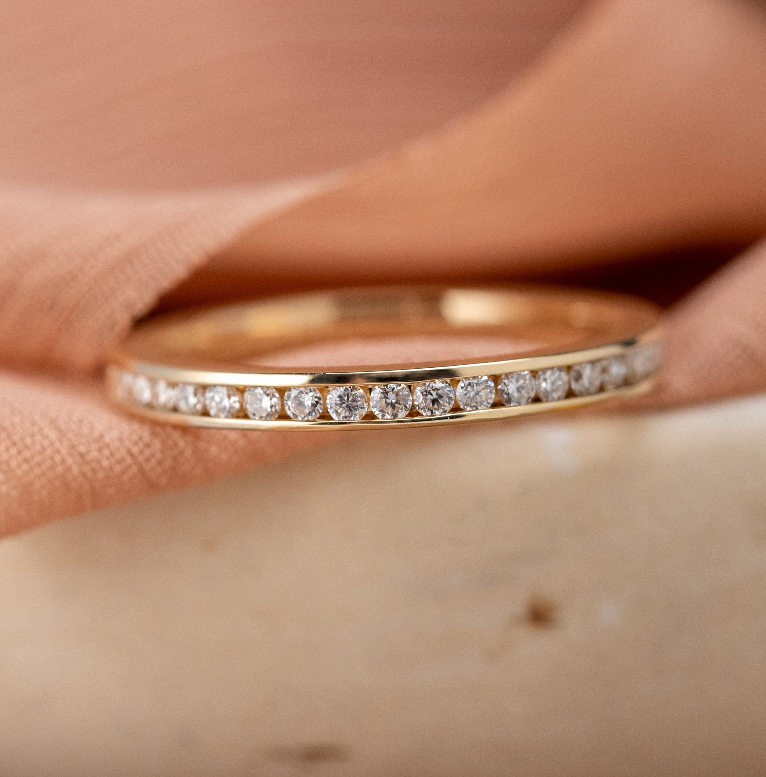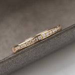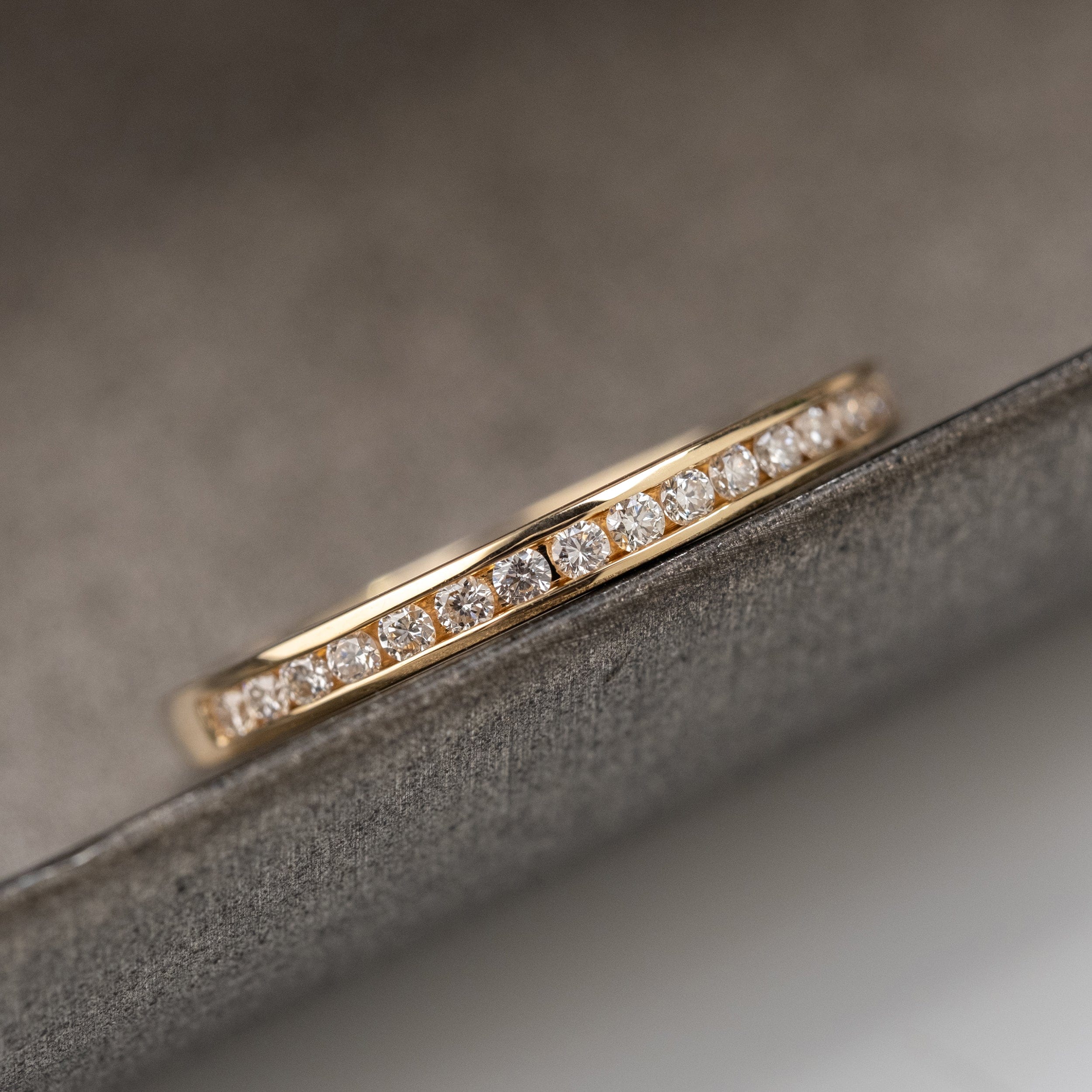 Featuring a row of diamonds that extend halfway around the band, this style pairs beautifully with any high-profile engagement, but can also be worn by itself for a subtle sparkle. The secure channel setting makes this band a perfect option for every day wear.