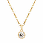 This timeless diamond bezel necklace features a 0.25ct round diamond, carefully selected for its exceptional quality and brilliant, white sparkle. Set in a sleek gold bezel, it offers a modern, minimalist look that pairs effortlessly with any outfit. Unlike mass-produced alternatives, our necklace showcases a superior diamond that stands out for its clarity and radiance, making it a perfect choice for those who value craftsmanship and quality over compromise. Available in larger sizes by request.
