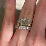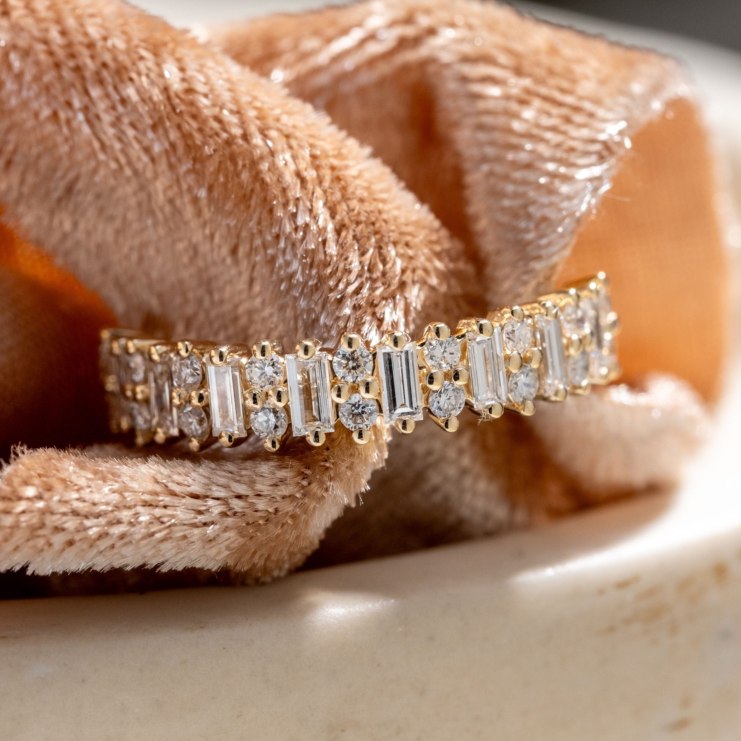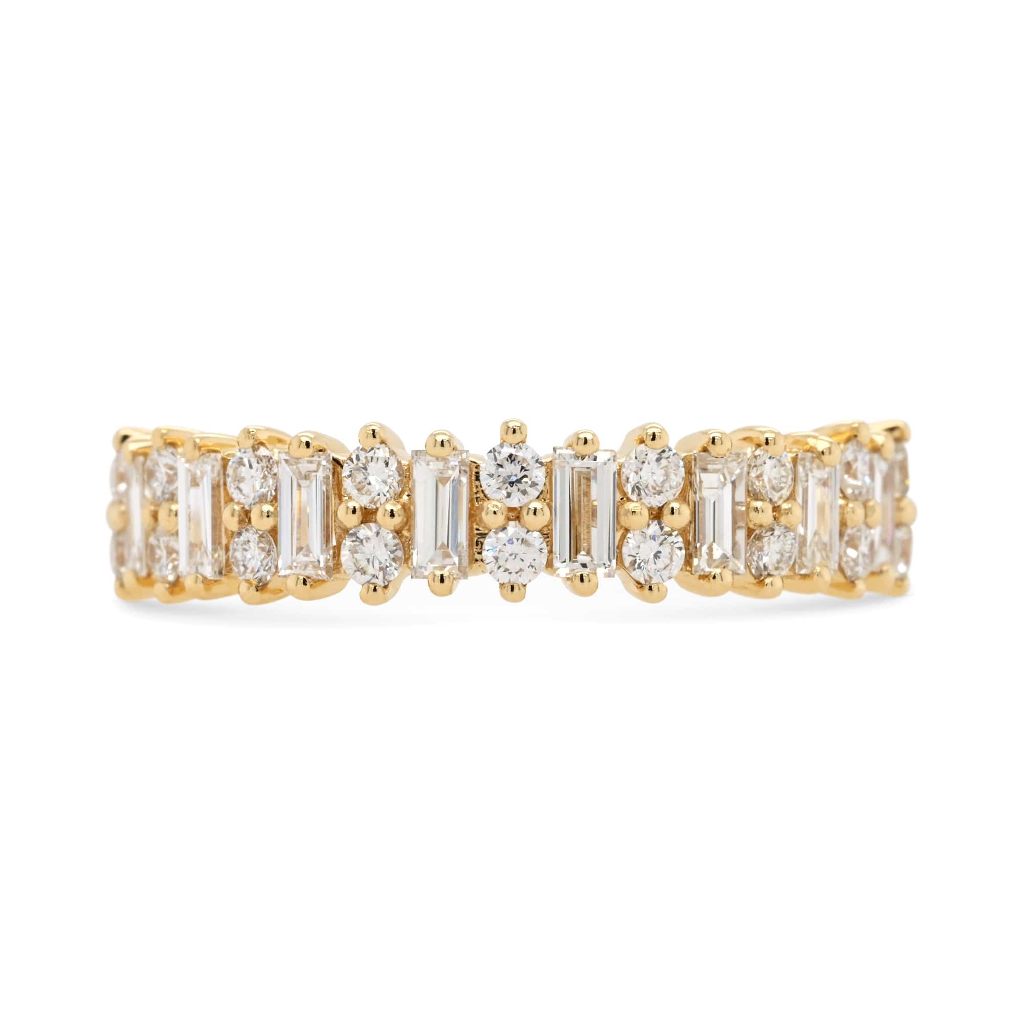 A jaw-dropping arrangement of baguette and round diamonds encircle this band which can be expertly crafted into the gold color of your choosing. Perfect as a wedding band, everyday addition to your stack, or a stunning stand alone spectacle of sparkle, our Double Diamond Baguette Band is sure to become a cherished favorite in your jewelry collection.