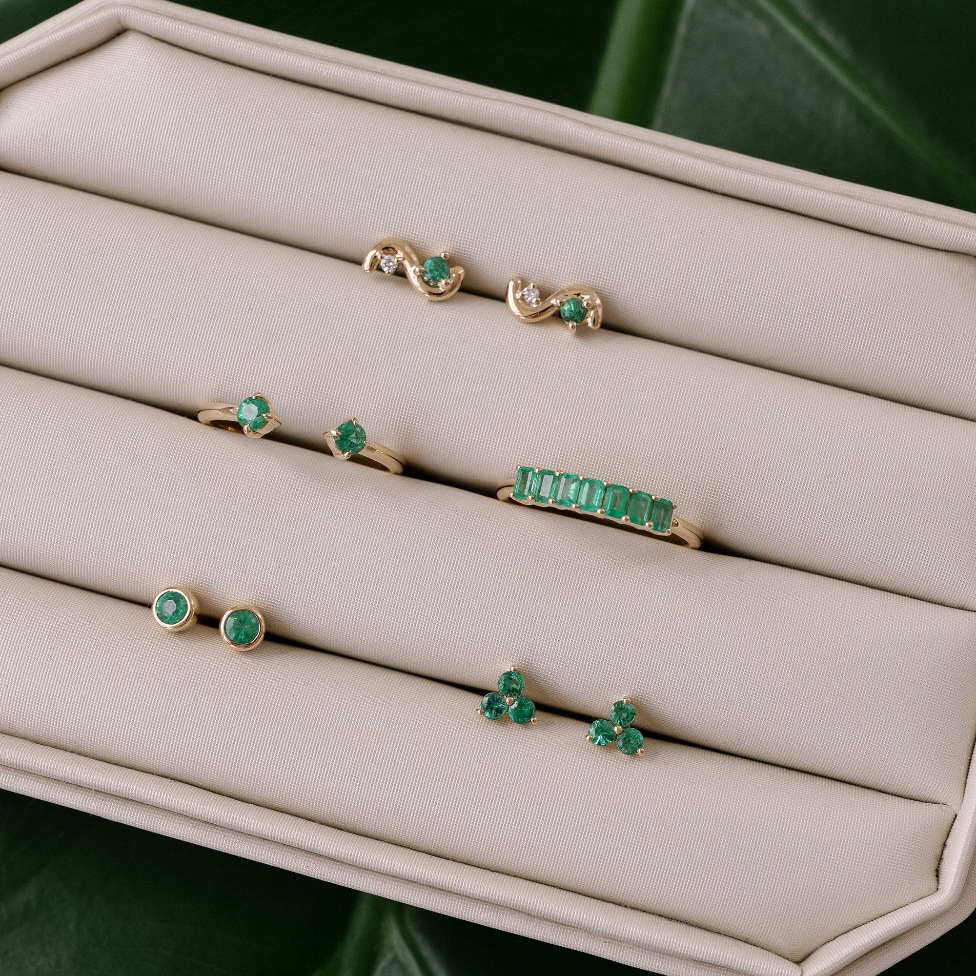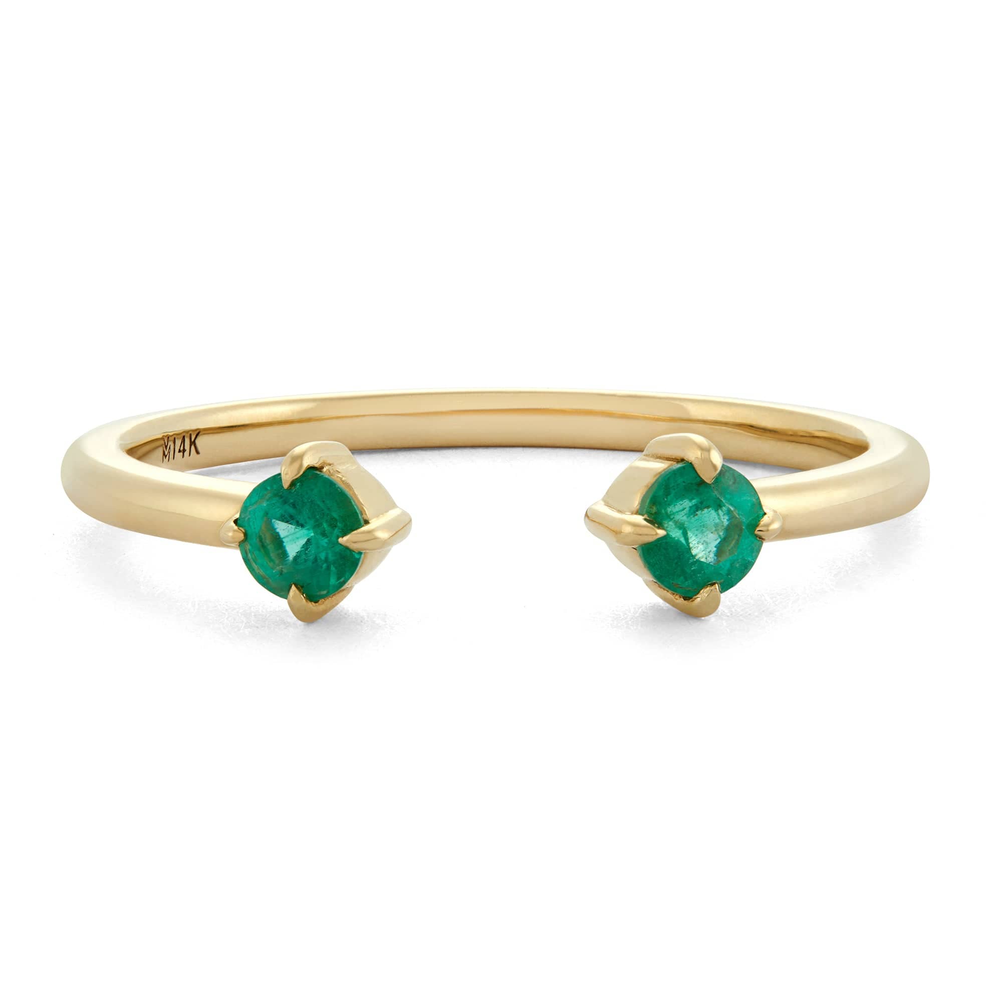 The Dua ring is an open setting set with matching vibrant emeralds and is finished with our signature compass claw prongs.