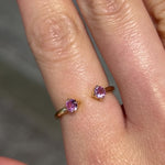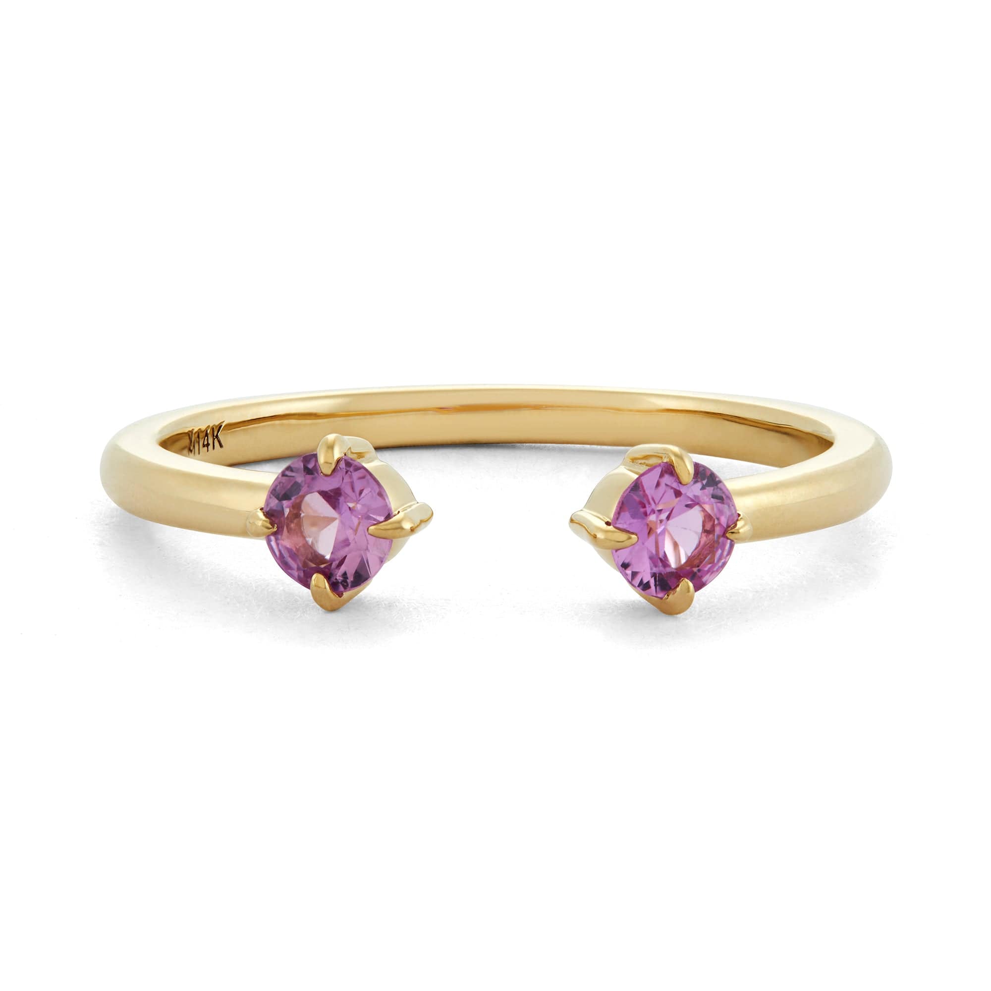 The Dua ring is an open band set with a pair of matching pink sapphires and is finished with our signature compass claw prongs.