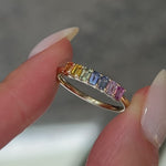 Featuring a row of rainbow emerald-cut sapphires, this ring is a wearable piece of art. Worn as a wedding band, engagement ring, or daily accessory, our Demi Band is a multifaceted must-have for your jewelry collection.