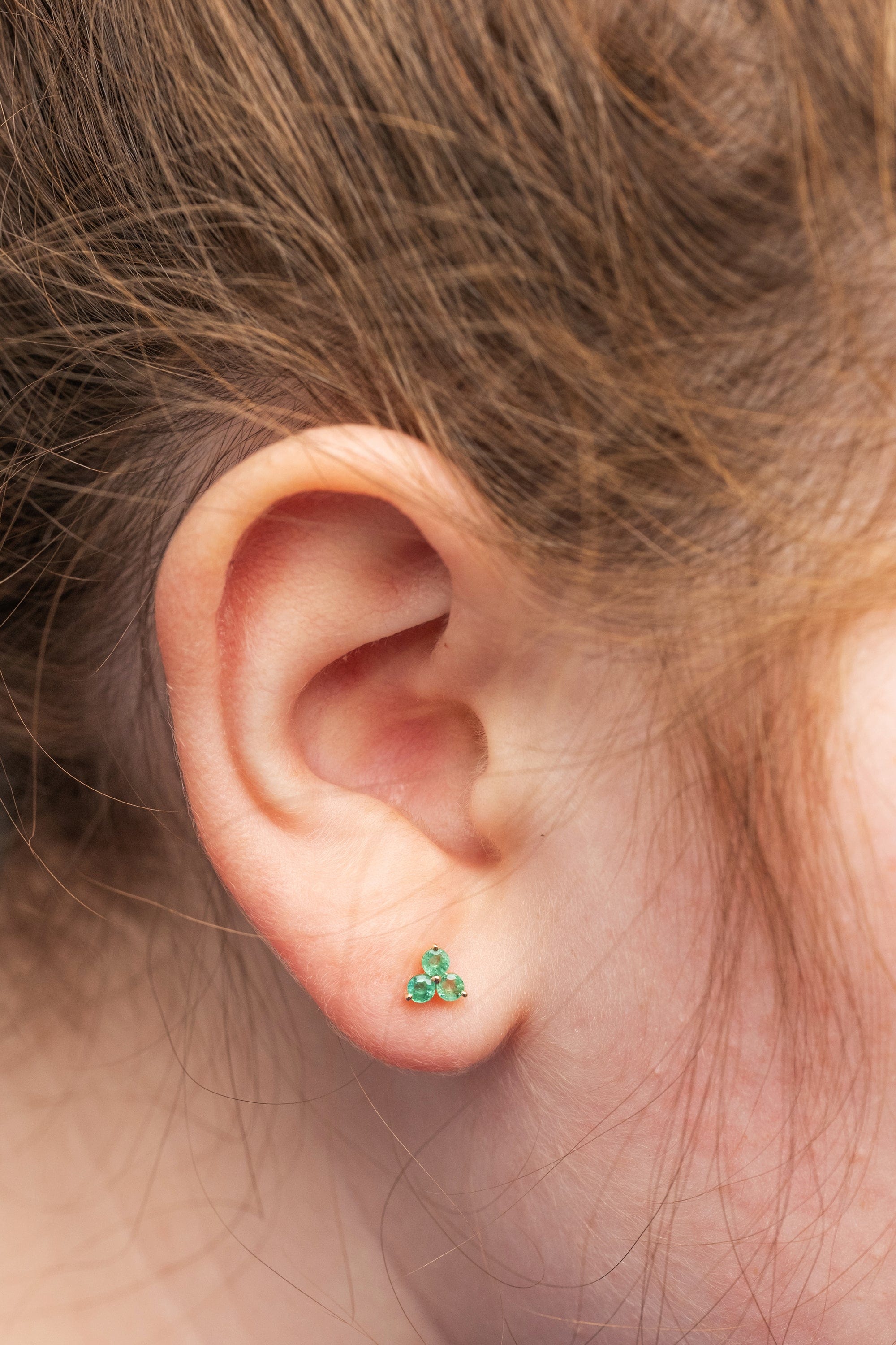 Embrace the lush allure of emeralds with this captivating trio set in 14k yellow gold. Add a touch of nature's beauty to your earring stack or let them shine brilliantly as a standalone statement pair.