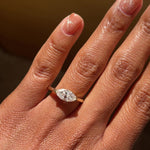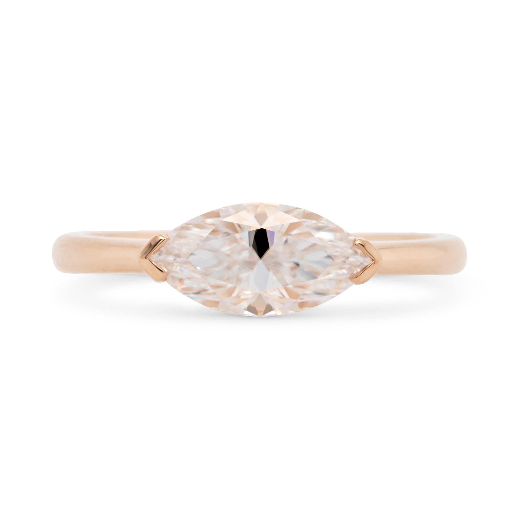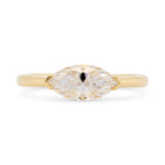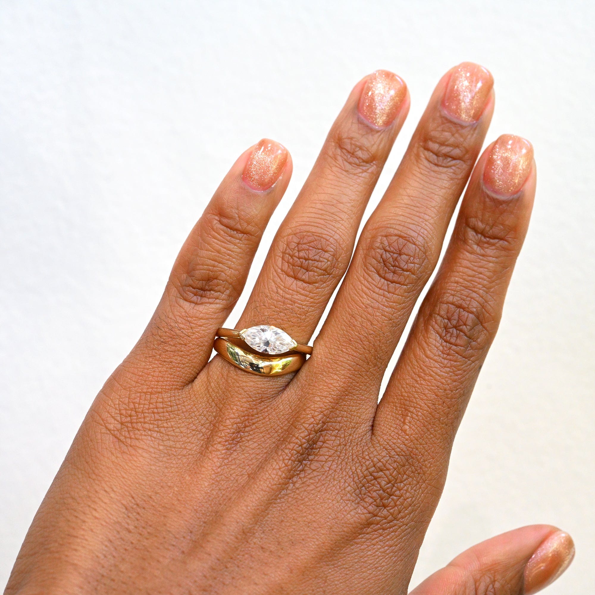 An original VM classic, we've set a marquise moissanite east-west to create unique interest and have secured the stone with sleek chevron prongs. This ring is low profile and will look best with a contoured band to hug the shape of the its curves.
