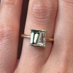 A bold take on symmetry, this ring features a striking pairing of a tapered green sapphire and a baguette-cut lab-grown diamond. Set side by side in a sleek bezel of polished yellow gold, it offers a distinctive, architectural elegance.