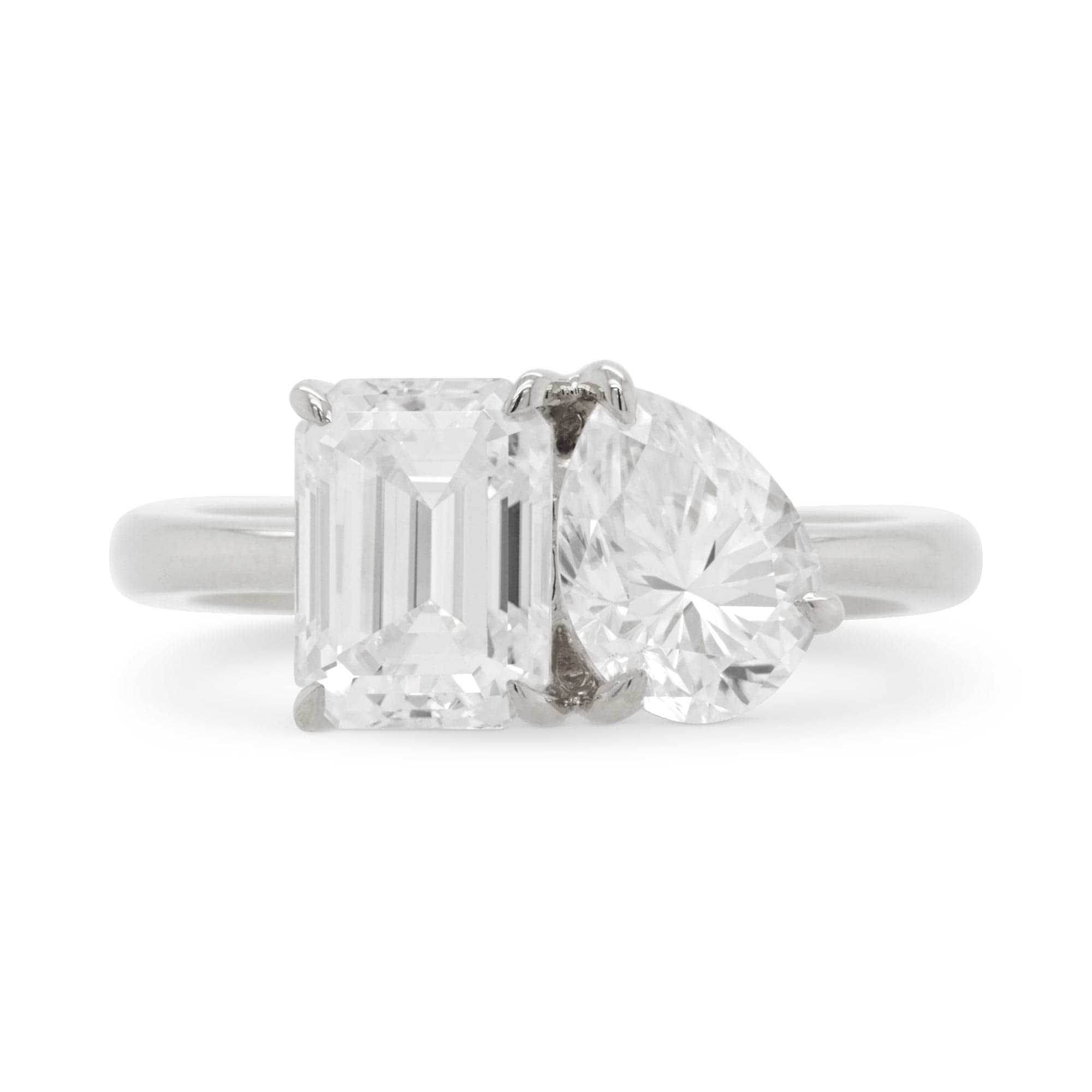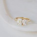Discover the timeless beauty of Gemma, our Toi et Moi engagement ring, featuring a stunning emerald-cut moissanite paired with a captivating pear-cut moissanite in a romantic embrace. This elegant, low-profile ring showcases a perfect blend of modern design and classic sophistication, making it an ideal choice for your unforgettable moments.