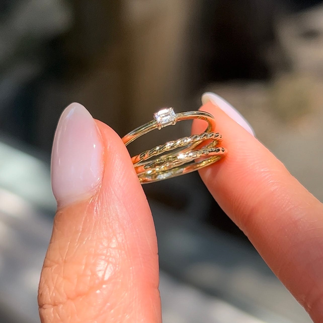 A versatile stacker with a hammered texture designed to be layered with other rings for a customizable and unique look.