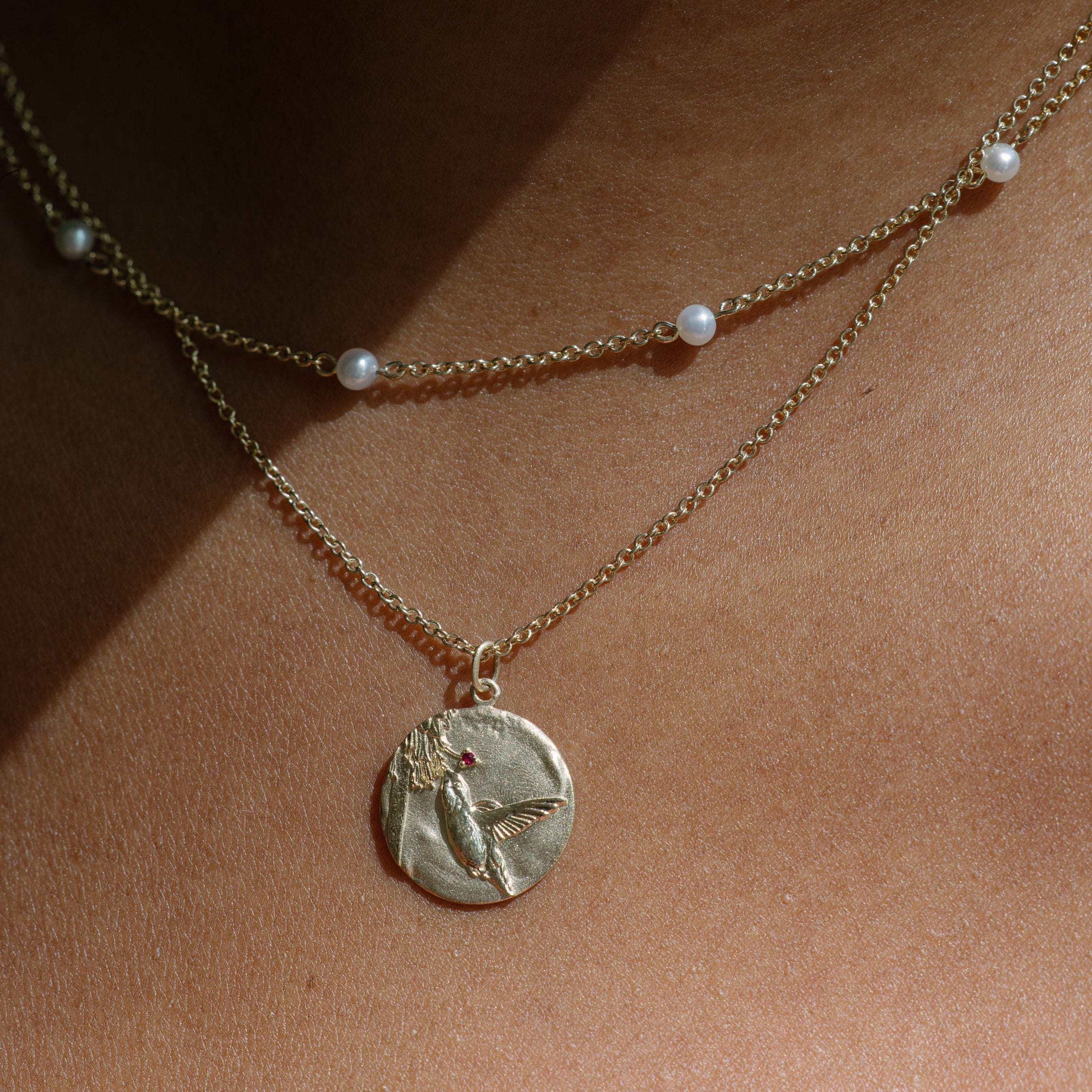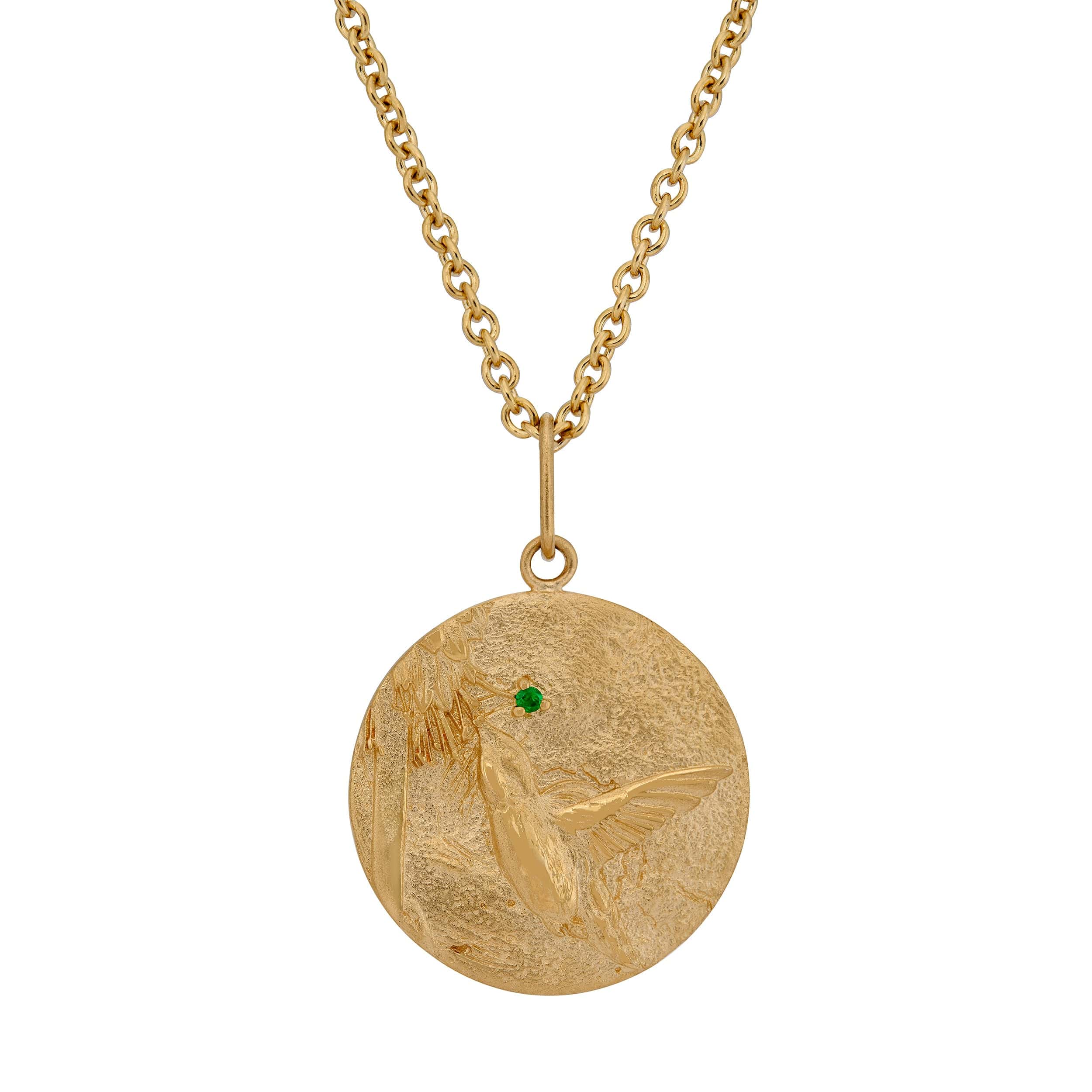 This pendant necklace features a detailed gold medallion engraved with a hummingbird in flight, accented by a small ruby or emerald. The textured disc hangs from a delicate gold chain, blending nature-inspired design with subtle elegance.