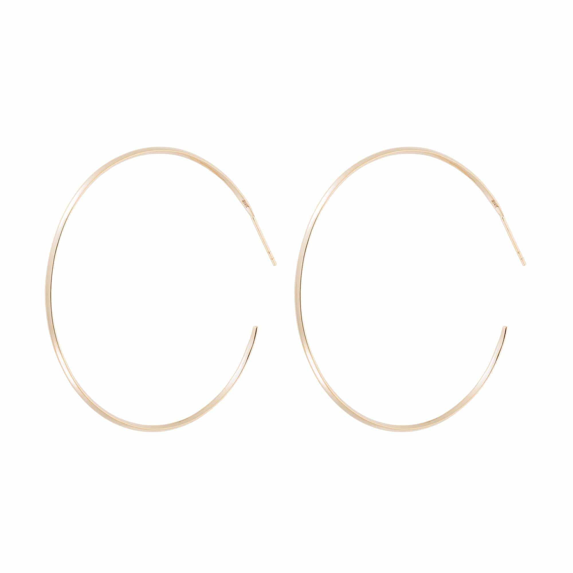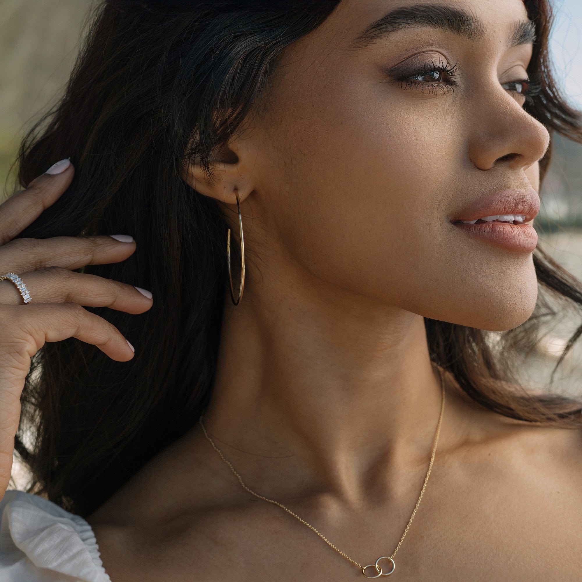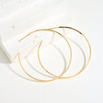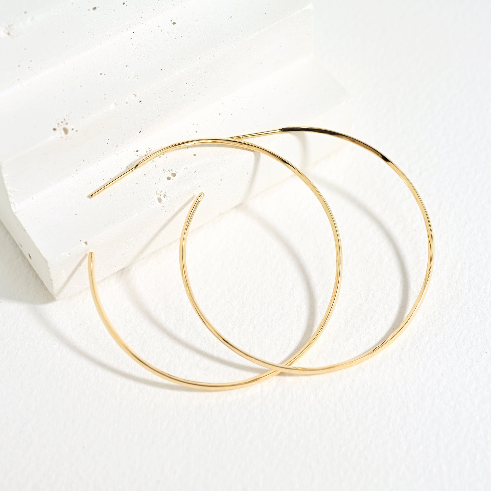 Updated to be thicker to resist bending, our largest hoop style is sleek and dramatic. A twist on the classic hoop earrings in a perfect size to capture bold elegance. These hoops have a unique knife edge on the exterior of the hoop. These earrings will arrive with their matching earring backs and the posts are double-notched for extra security.