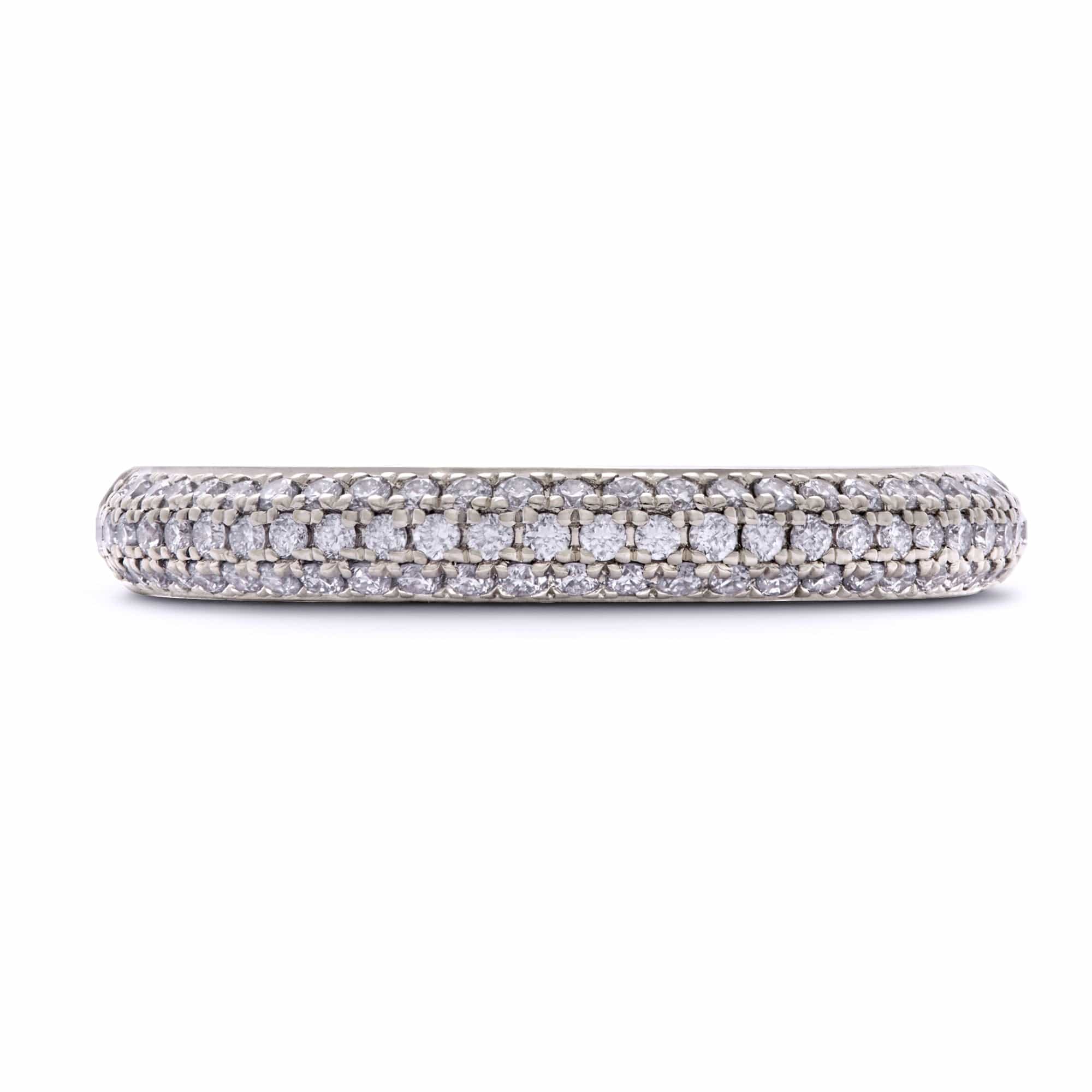 This micro-pavé band features diamonds set closely together with minimal visible metal, creating a shimmering and intricate appearance. Incredibly comfortable, this ring will not disappoint with its limitless wearability.