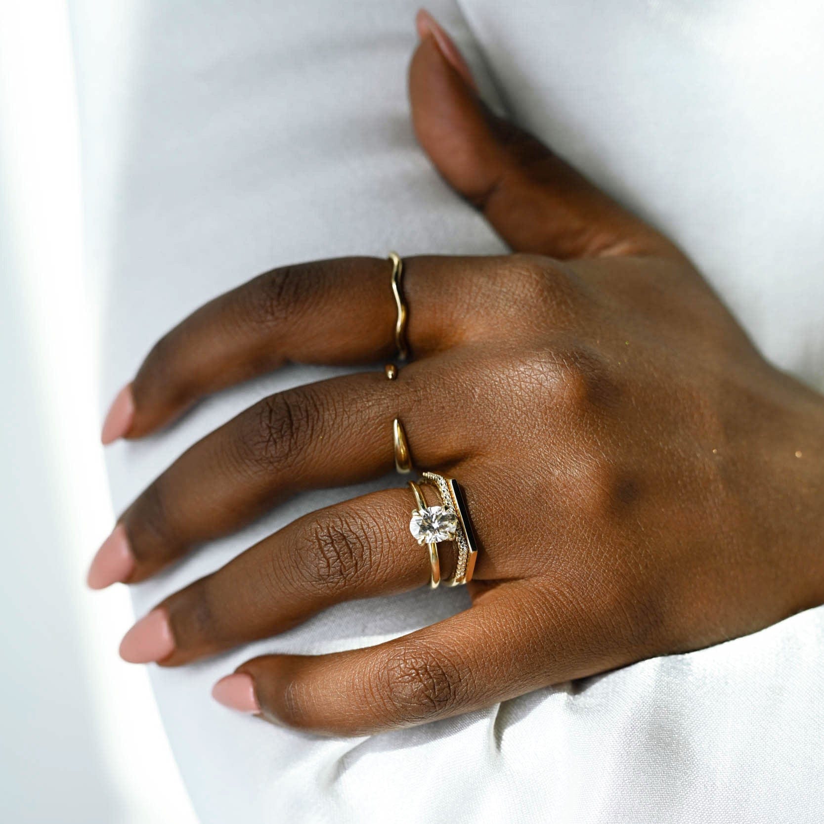 With an open tapered center, this solid gold 14k band offers a wide variety of pairing options with high or low profile center stone rings. Its sleek, modern simplicity also makes it great for everyday wear with a subtle hint of shine. For those desiring more sparkle though, we have a pavé version available too!