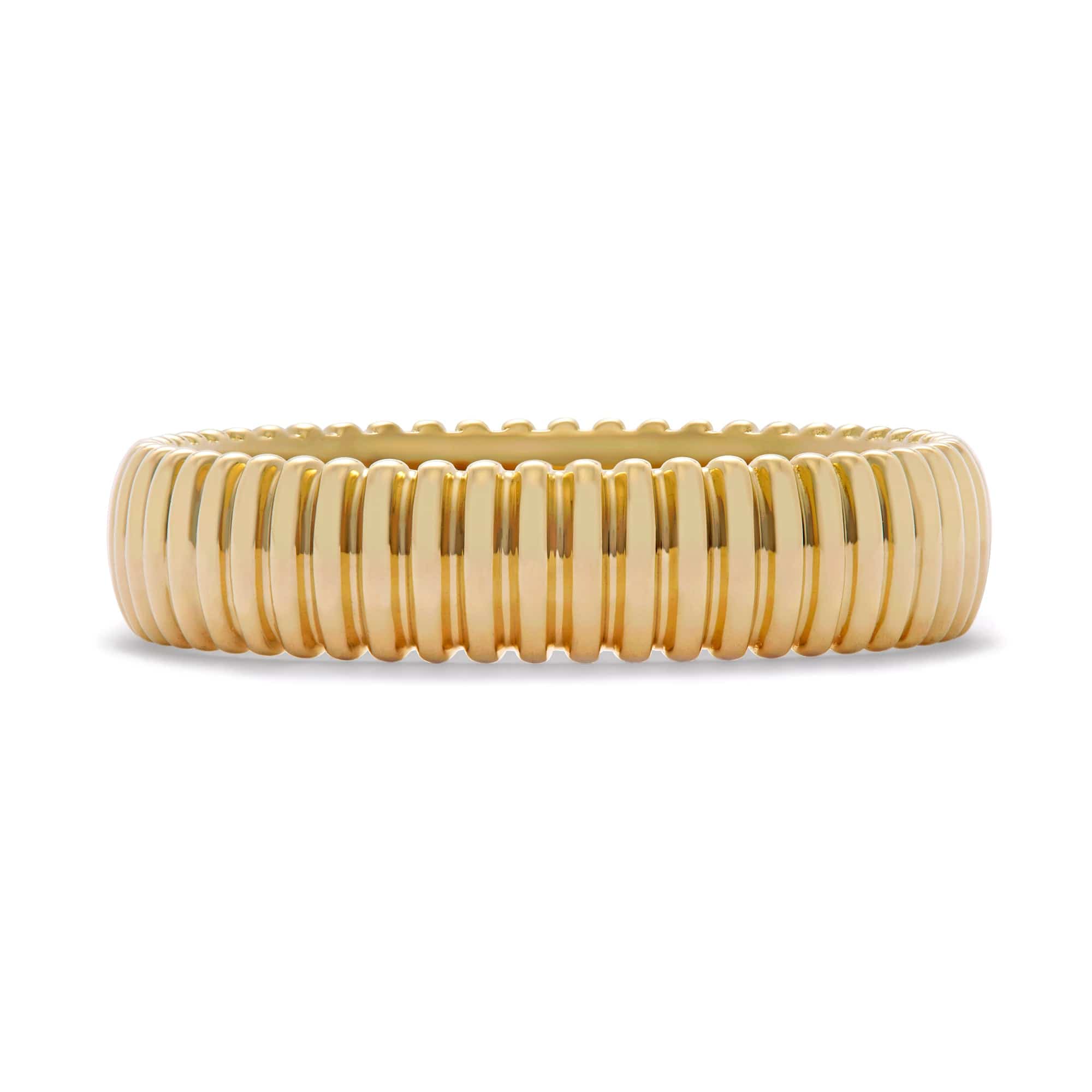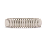 With a uniform pattern of channels sculpted into this rounded band, this ring has a low profile and comfortable inner edges. This is a great unisex band for any wearer.