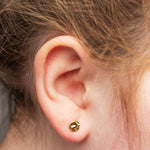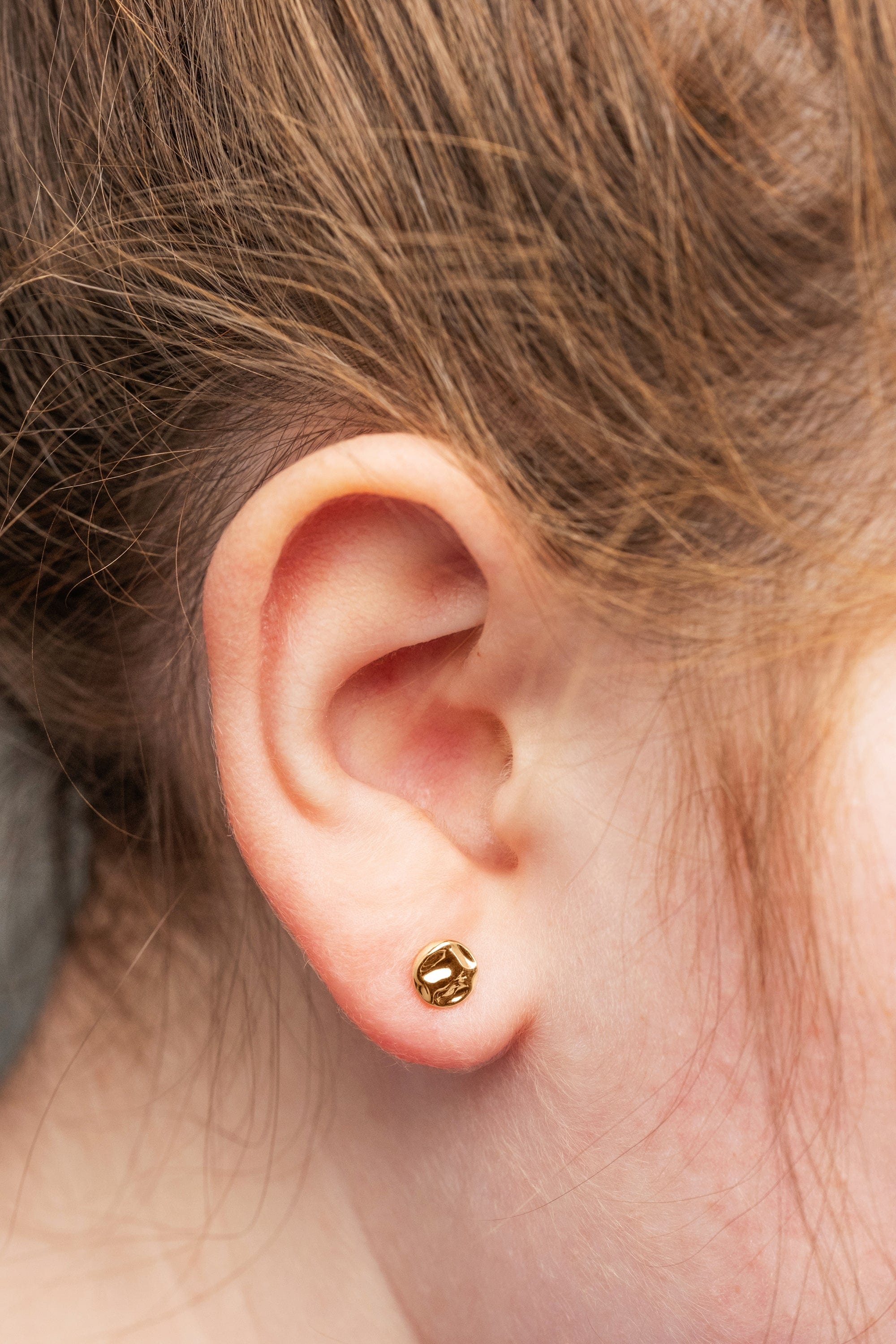 These petite gold stud earrings feature a softly textured surface, giving them an organic, sculptural feel. Their gentle curves catch the light beautifully, adding subtle dimension to a timeless design. Effortlessly modern with a touch of character.