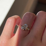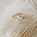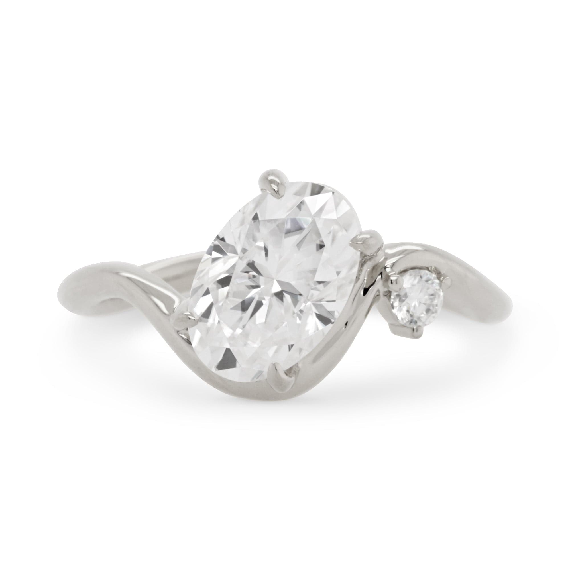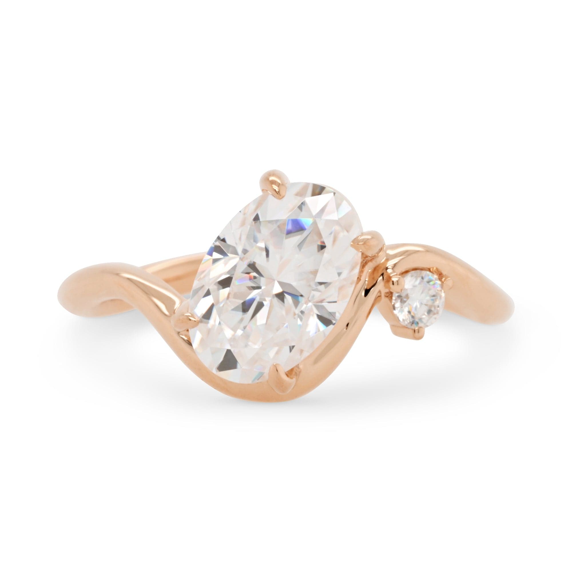The sculptural waves of our Venus setting hug an exquisite oval cut moissanite. Accented with a smaller moissanite that adds a touch of sparkle, this low-profile ring combines comfort and sophistication.