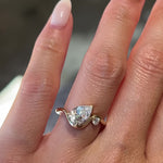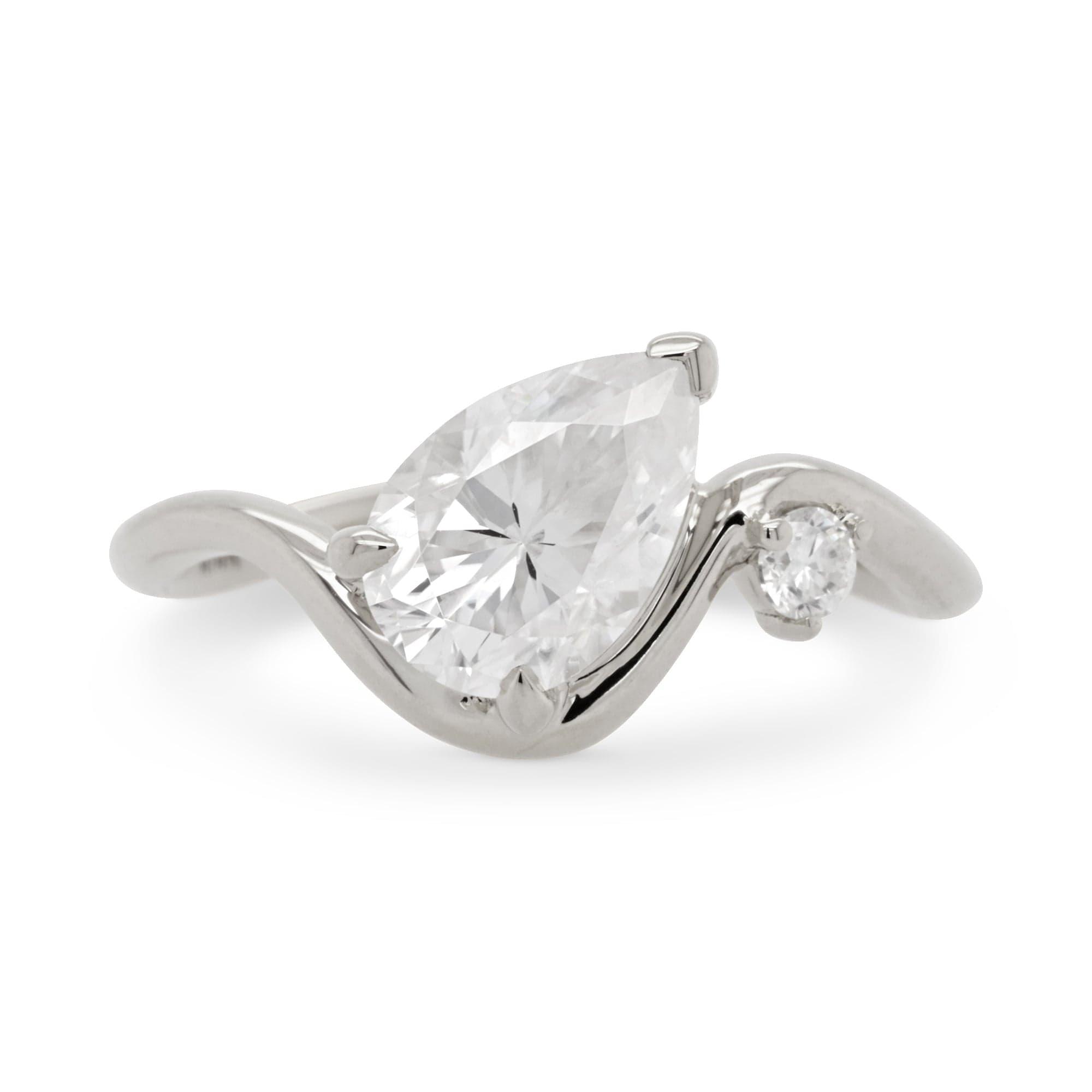The sculptural waves of our Venus setting hug an exquisite pear cut moissanite. Accented with a smaller moissanite that adds a touch of sparkle, this low-profile ring combines comfort and sophistication.