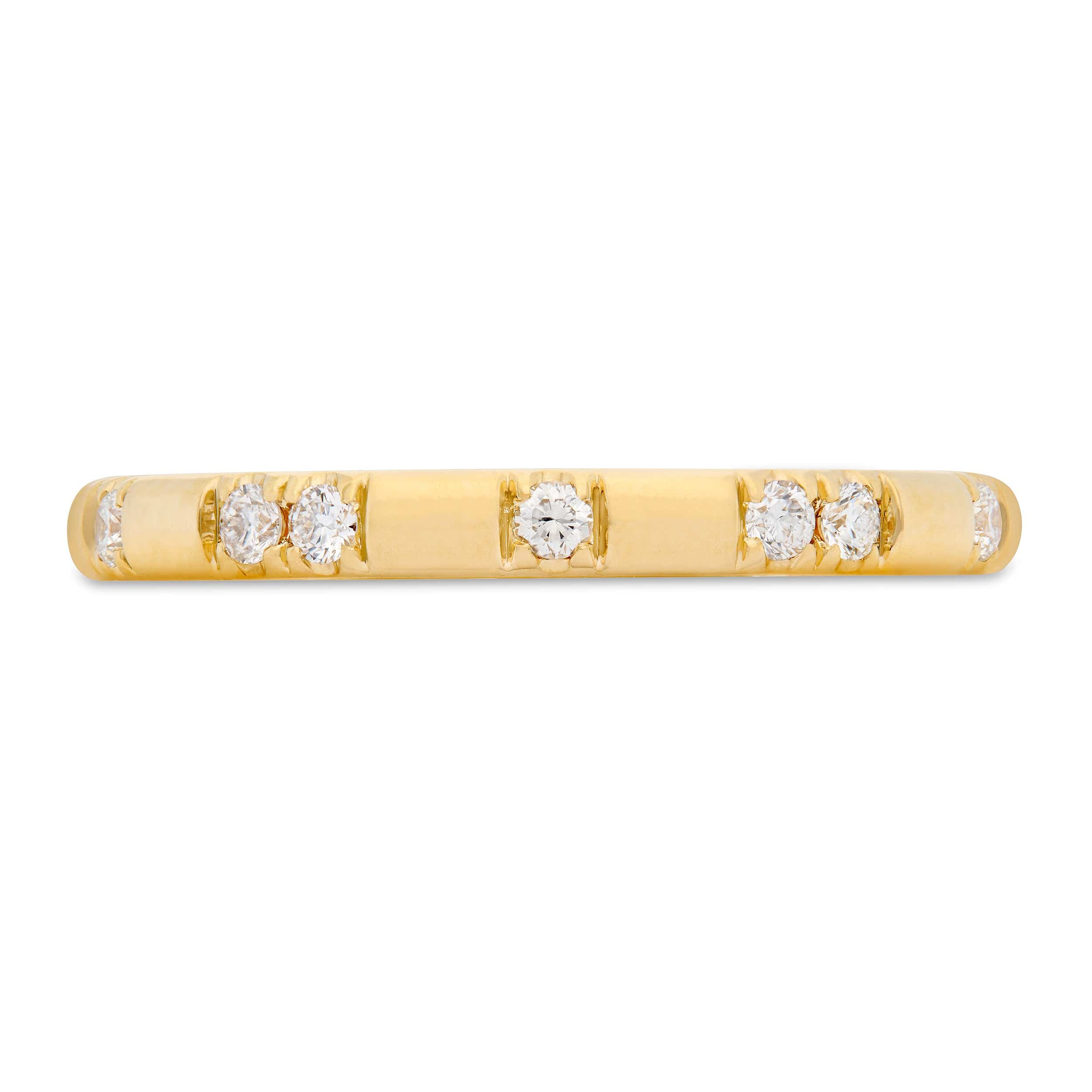 This band is crafted in polished yellow gold and adorned with round-cut diamonds, each highlighted by delicate accent engravings. This elegant design blends subtle sparkle with refined detail, perfect for stacking or wearing solo.