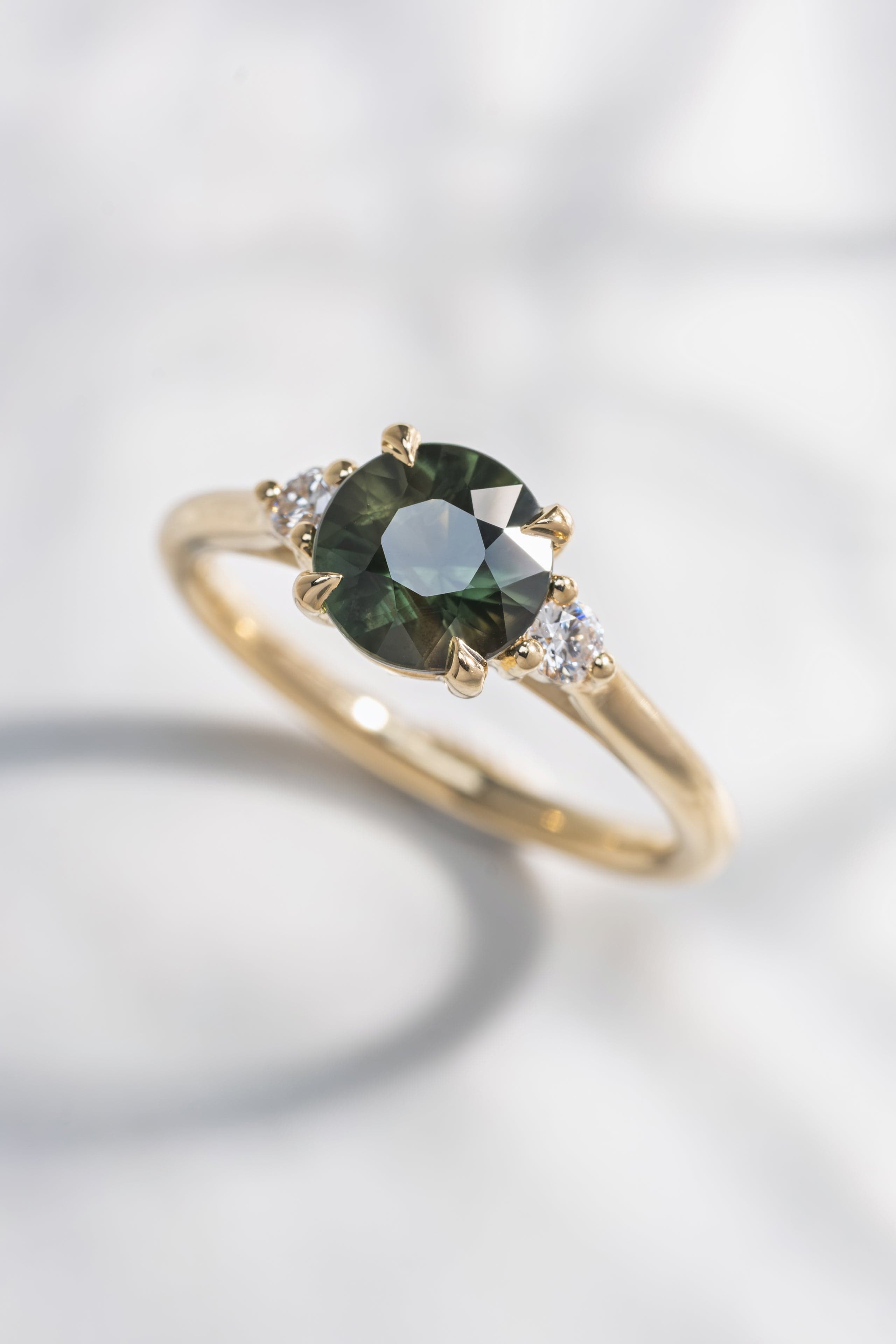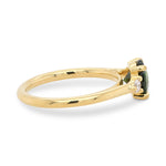 This ring features a round green sapphire set in 14K yellow gold, accented by natural diamonds that add a softness to the design. Designed for those drawn to distinctive color and thoughtful craftsmanship, this ring offers a striking yet understated presence.