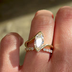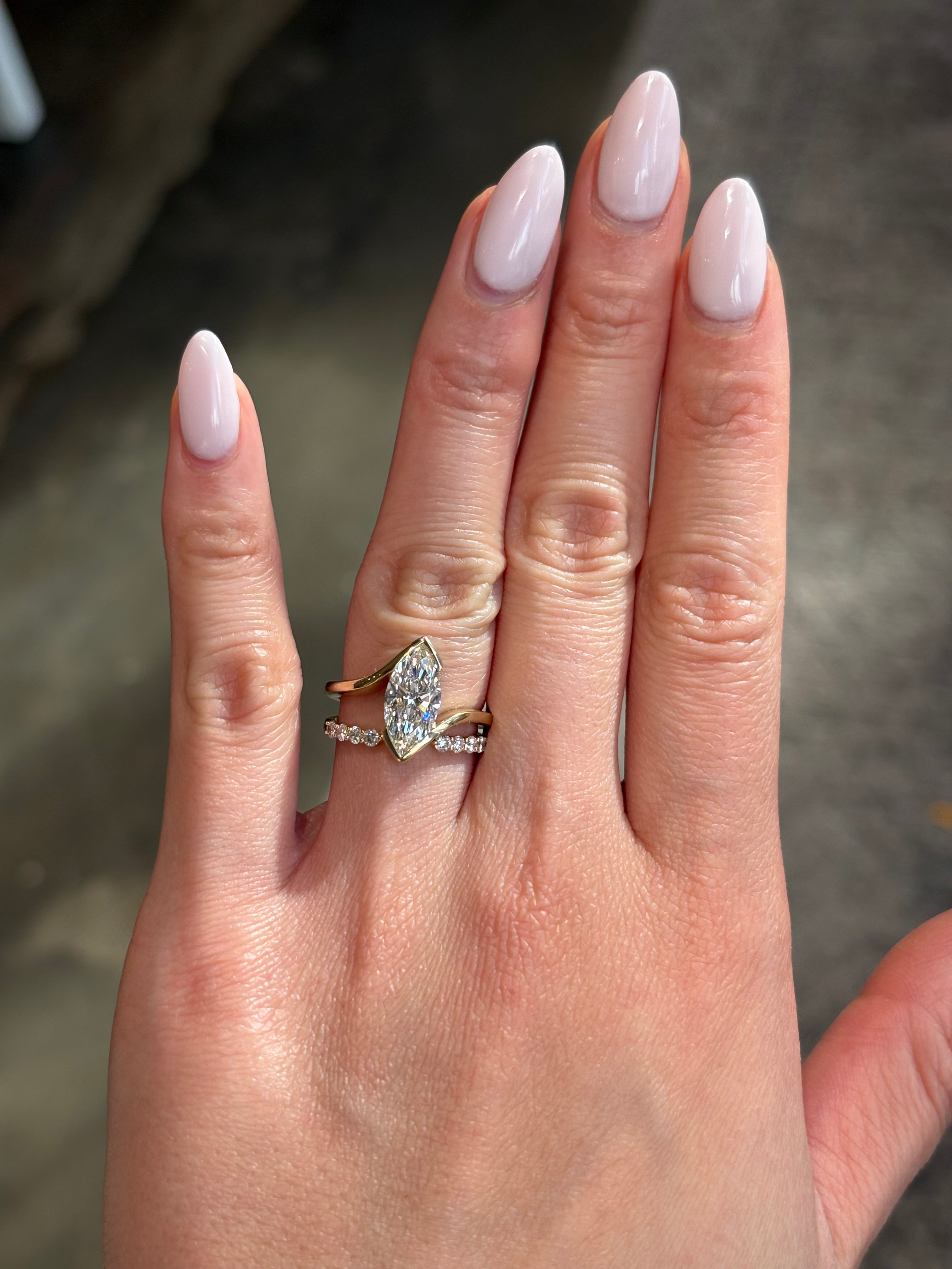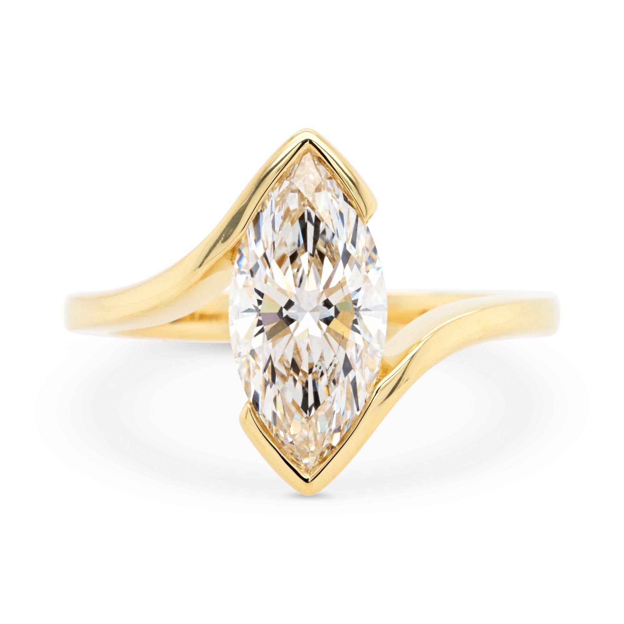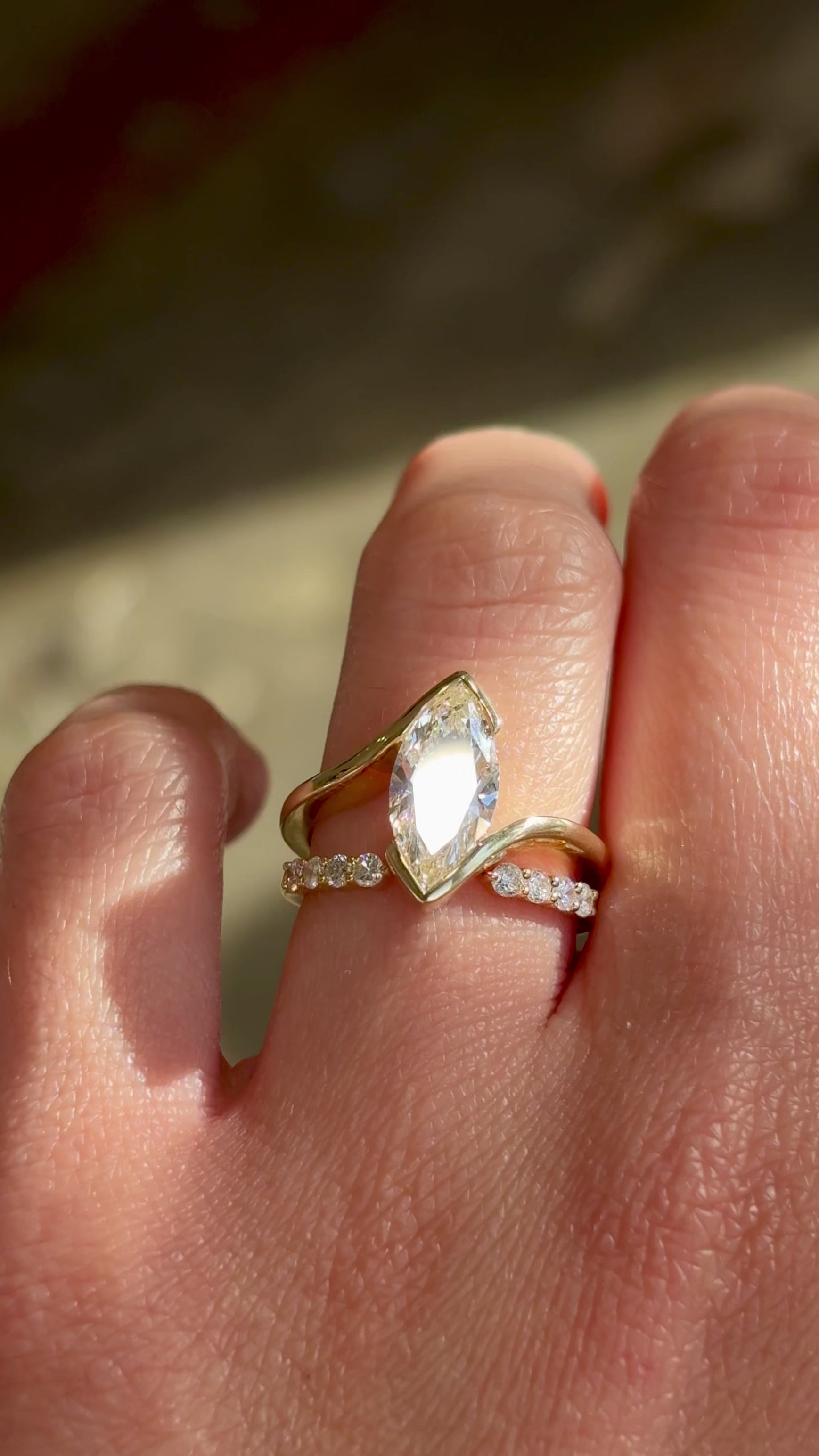 Set in polished 14K yellow gold, the diamond is embraced by a flowing, curved setting that follows the shape of the stone. The gold sweeps upward on each side, forming protective V tips at the points while creating a sense of movement and fluidity. This bypass inspired design feels modern and architectural, with soft curves that balance the sharp elegance of the marquise.