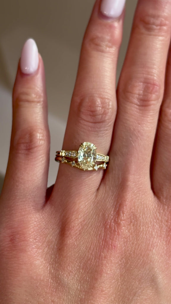 In many cultures, the engagement ring is traditionally worn on the left hand's ring finger, symbolizing a direct connection to the heart. During the wedding ceremony, some move their diamond engagement rings to the right hand to make space for the wedding band, later wearing them together on the left hand.