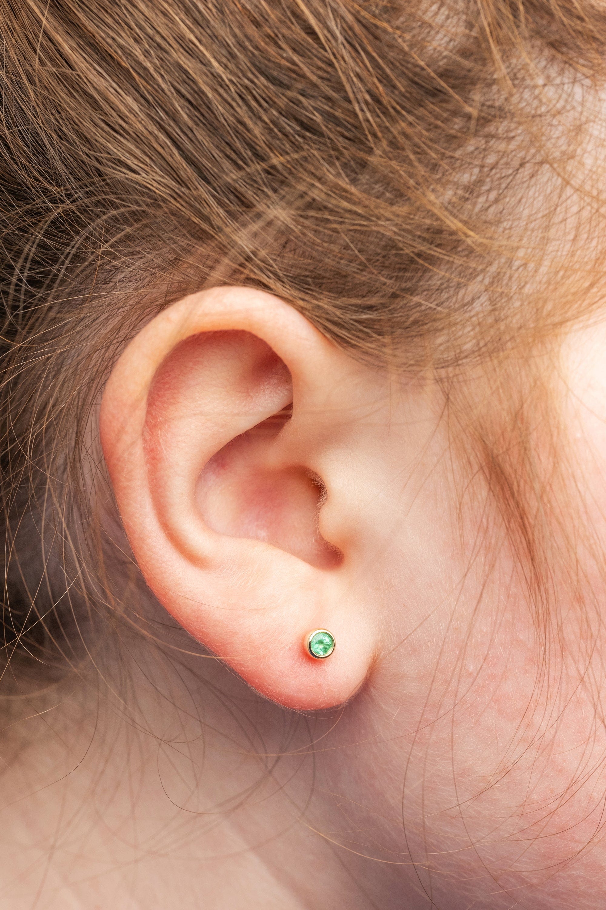 A classic emerald stone set in a sturdy bezel, perfect for layering with additional piercings or on its own for timeless sparkle.