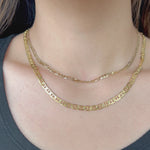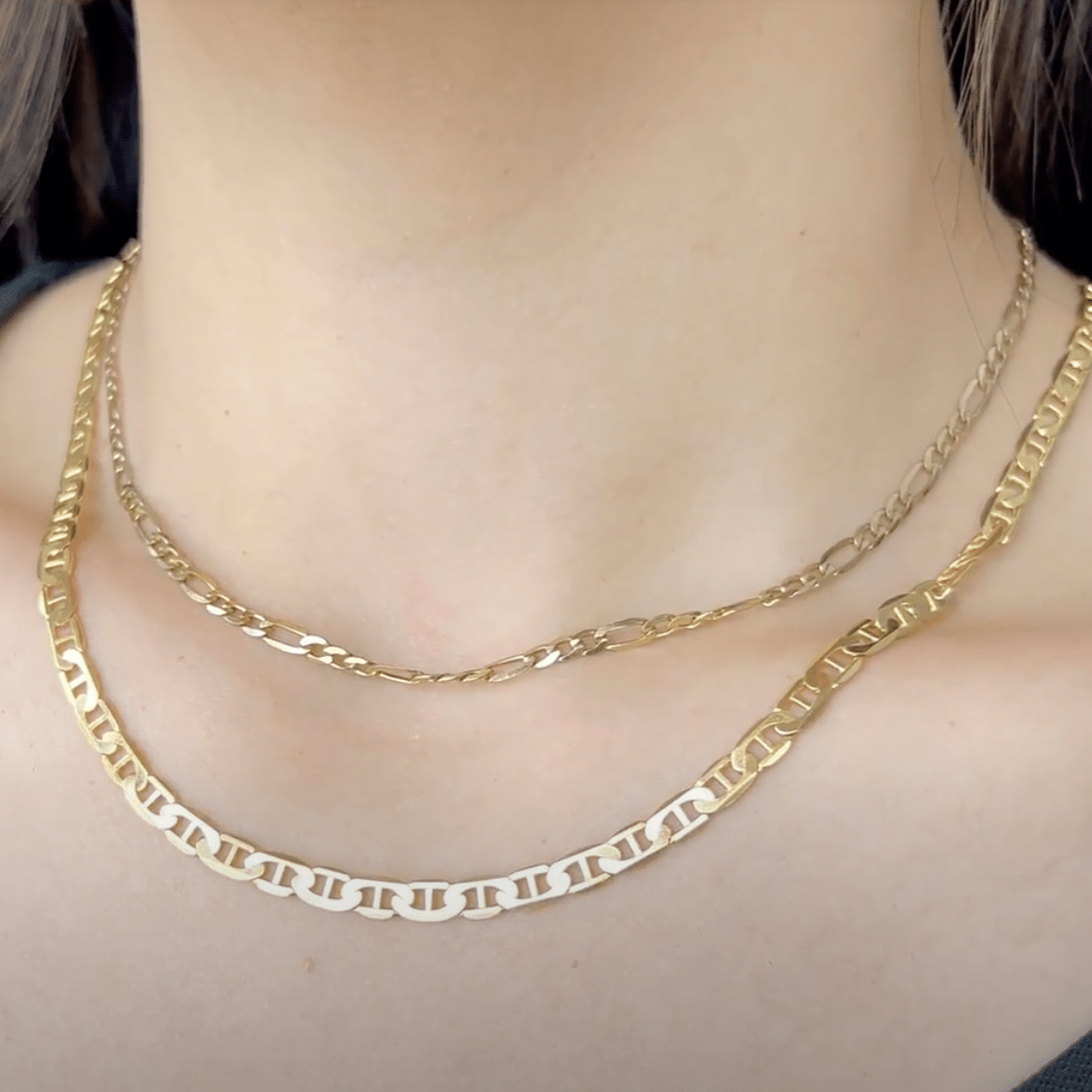 Our medium-weight Figaro chain necklace makes for a great everyday statement piece. Shown layered with our Heavy Mariner chain necklace, but can be worn on its own as a timeless classic. Model is wearing a 16" with a 20" Heavy Mariner chain necklace