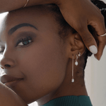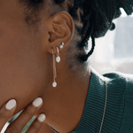 Elegant and minimal with an iridescent pearl that graces the jawline, these threaders are a beautiful way to elongate the neck. The U-wire at the top of the earring creates the perfect balance between the two ends.