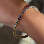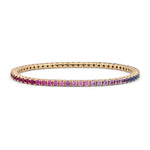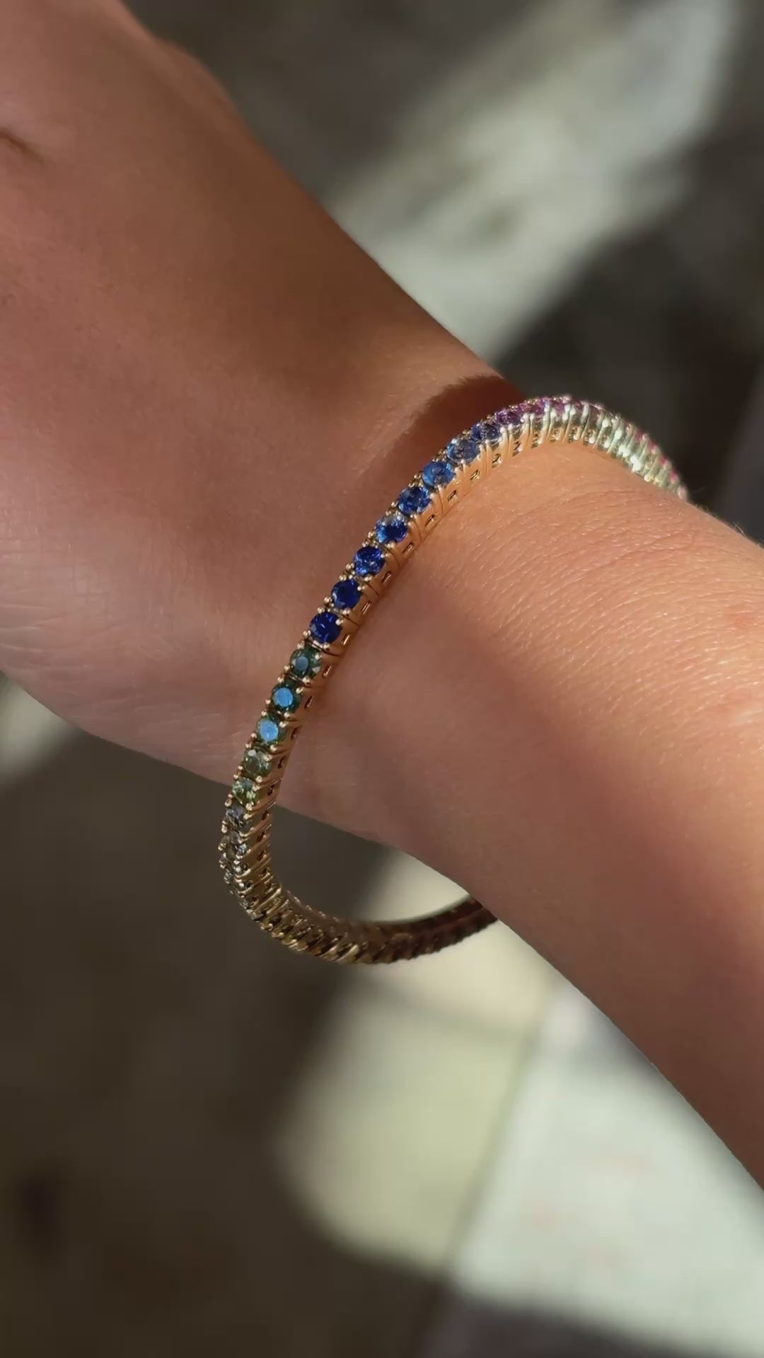 A vibrant spectrum of hand-selected sapphires radiates across this flexible 14K gold bracelet, capturing the full beauty of the rainbow in every movement. Designed for comfort and lasting shine, it’s a refined piece that brings color to every day.