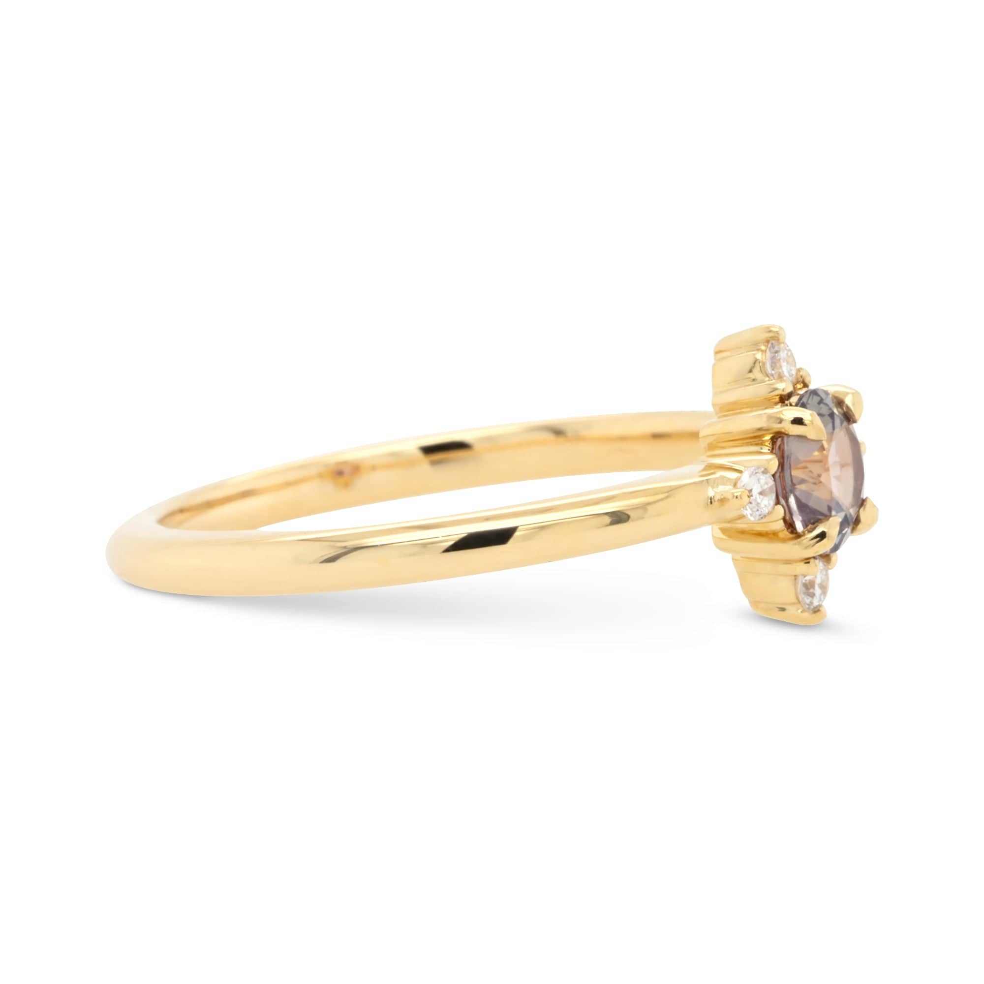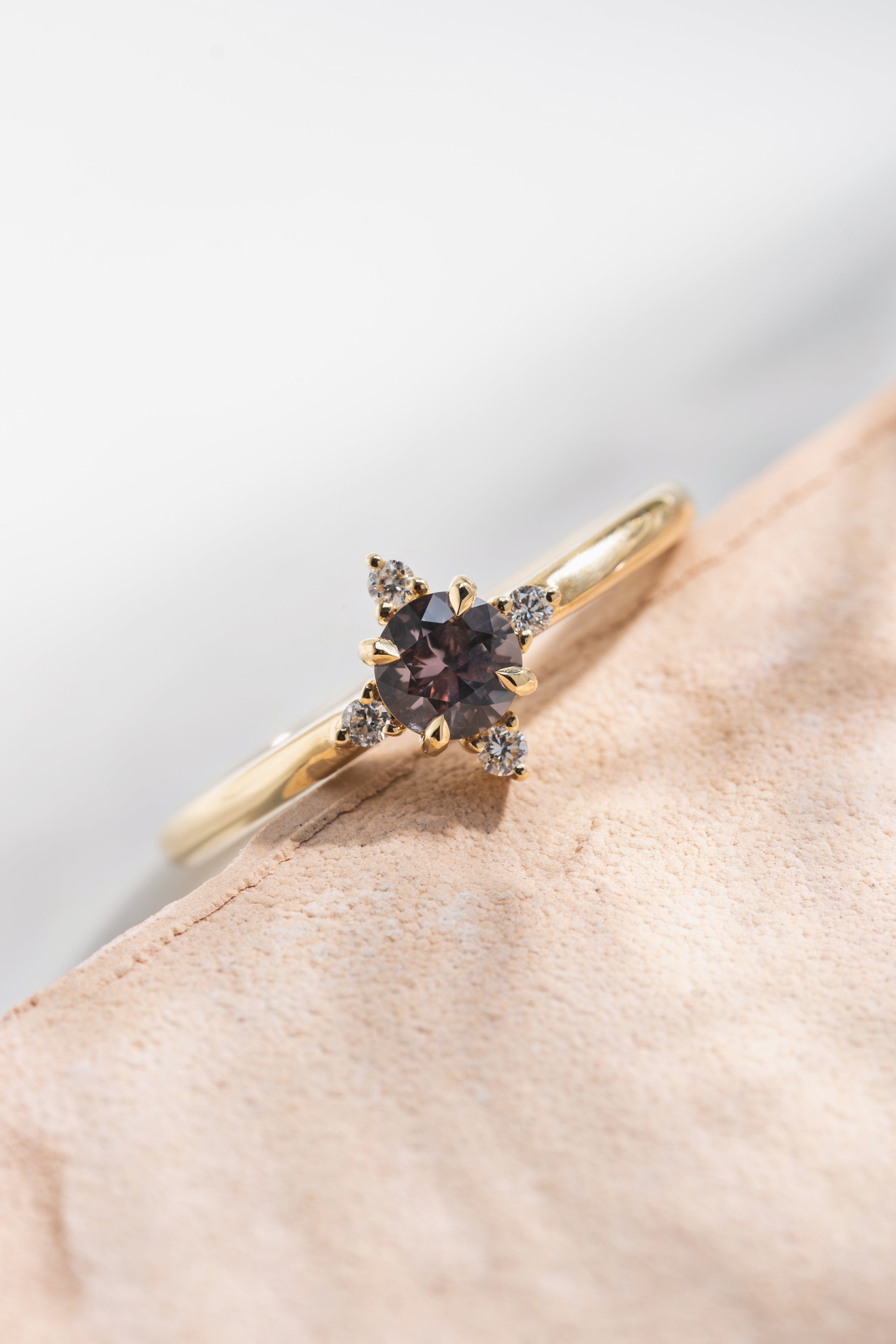 This ring centers on a unique grape-colored purple sapphire, framed by compass of sparkling white diamonds that enhance its depth and color. Set in warm yellow gold, the design strikes a balance between classic structure and bold color, making it a standout piece with refined character.