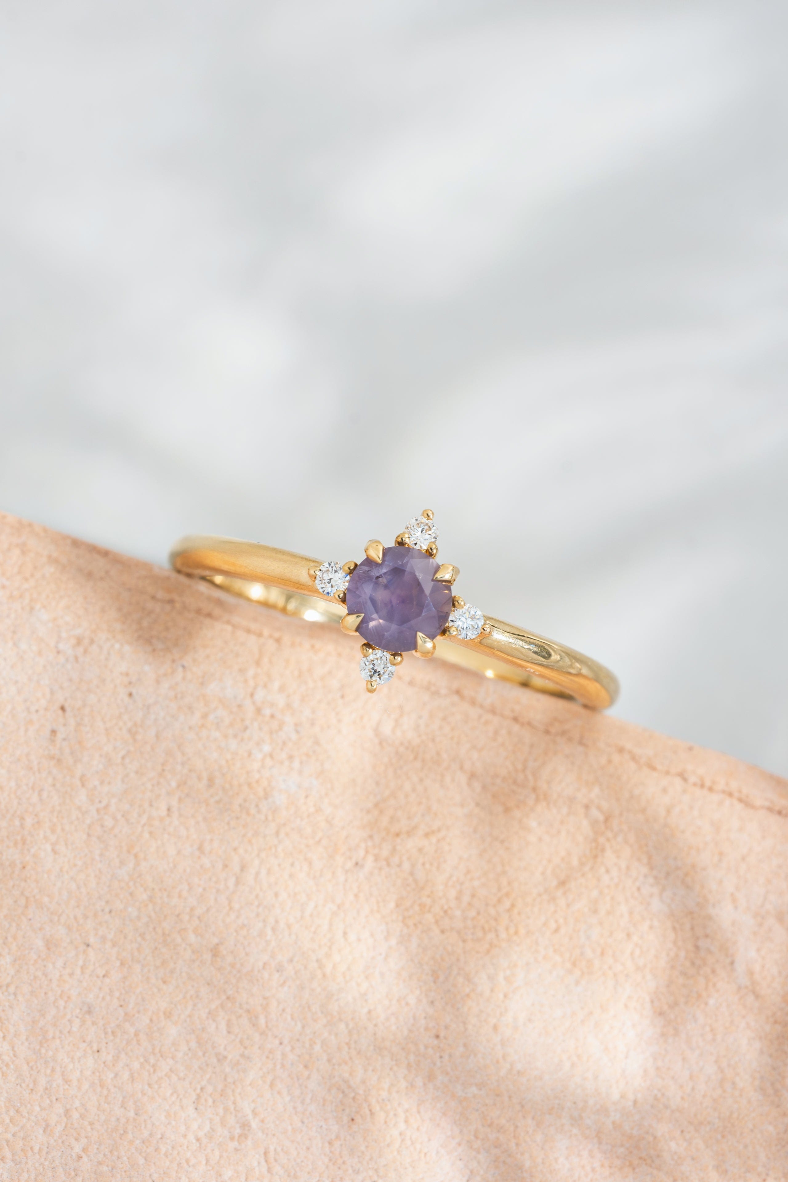 This ring centers on a unique opaque purple sapphire, framed by compass of sparkling white diamonds that enhance its depth and color. Set in warm yellow gold, the design strikes a balance between classic structure and bold color, making it a standout piece with refined character.