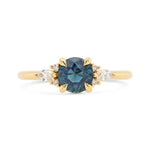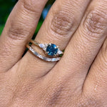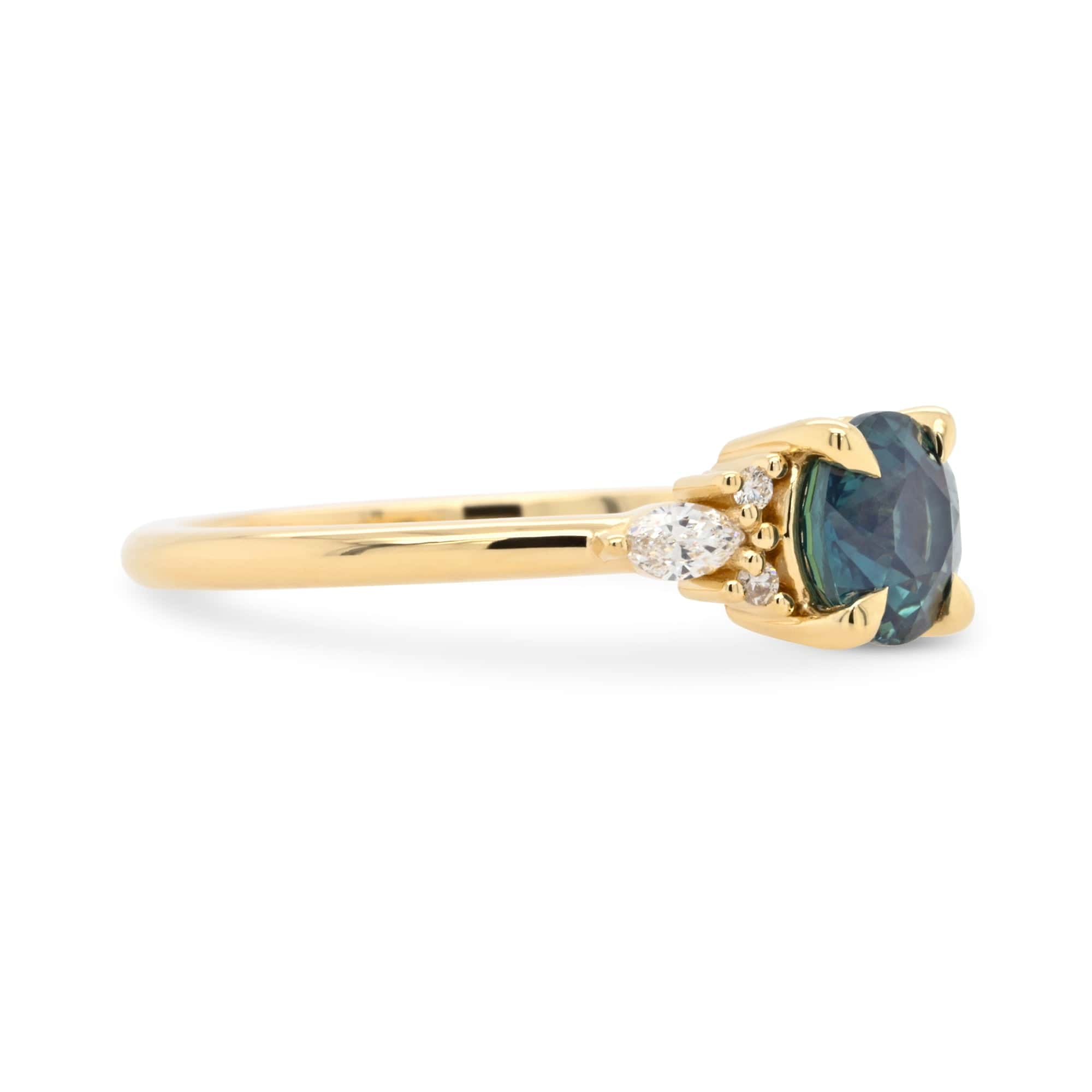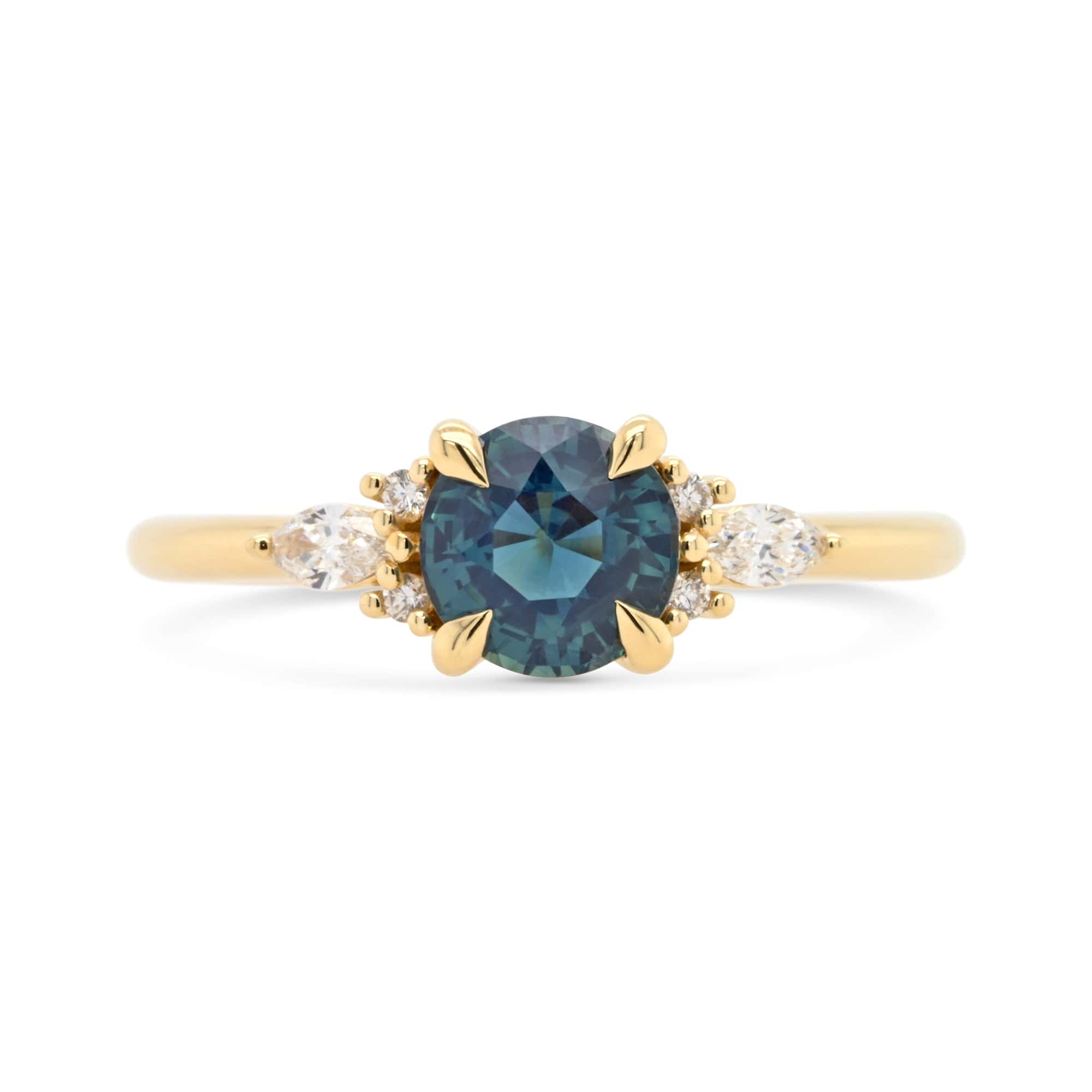 This warm yellow gold setting with bite-sized melee perfectly frame a aqua blue sapphire. Timeless and modern for any wearer.