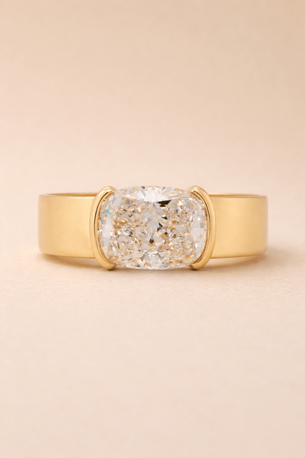 This chic ring features a stunning cushion antique-cut lab-grown diamond, bezel-set in a sleek yellow gold band for an effortlessly luxe vibe. Beautifully balanced, it’s perfect for the style-savvy romantic who loves a look that’s both fresh and forever.