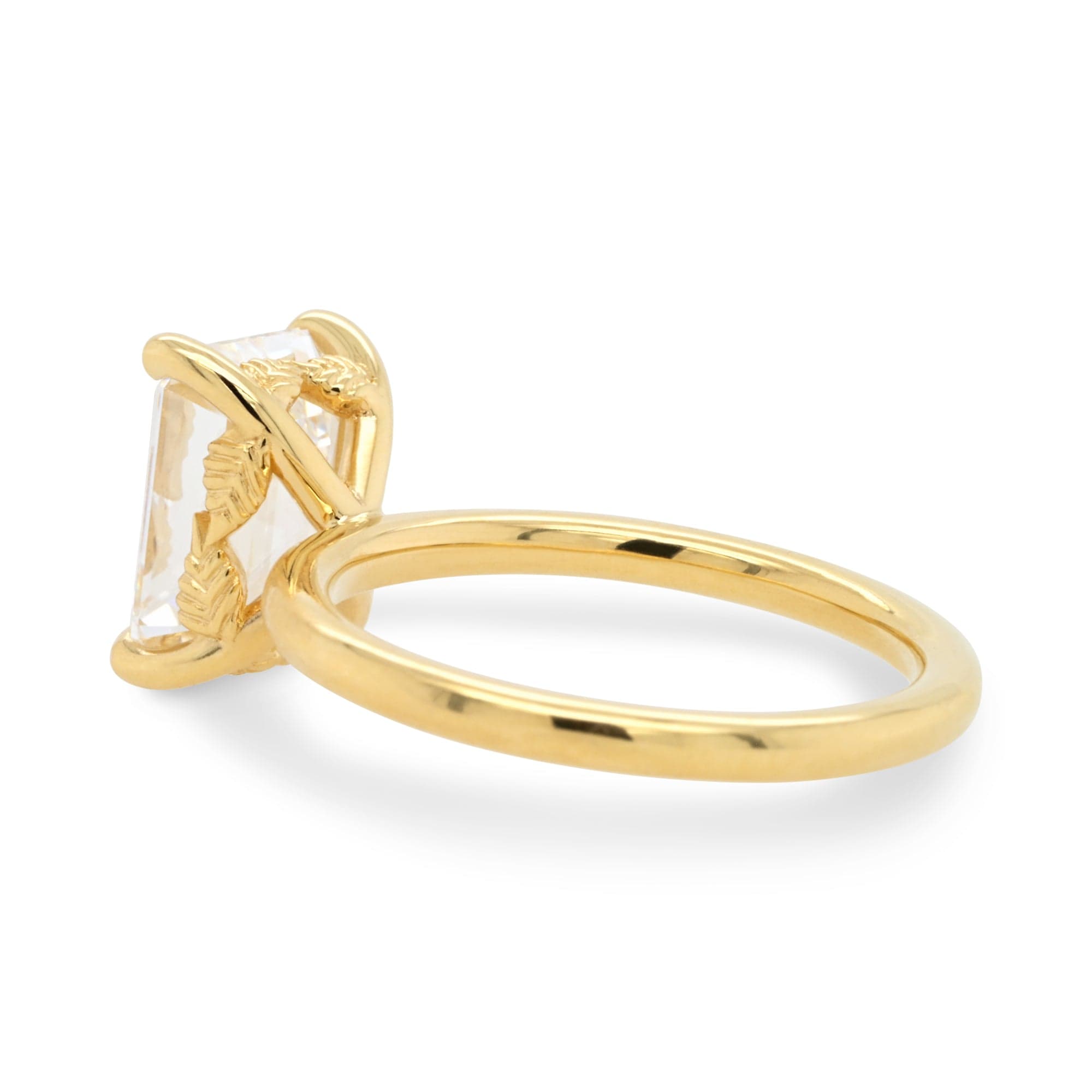 The Flora setting is an engagement ring inspired by organic design. The warm gold band features carved leaf accents that reference botanical forms without overwhelming the design. These details reflect traditional craftsmanship and give the ring a timeless, personal feel. The Flora setting is designed for those drawn to nature-inspired elegance.