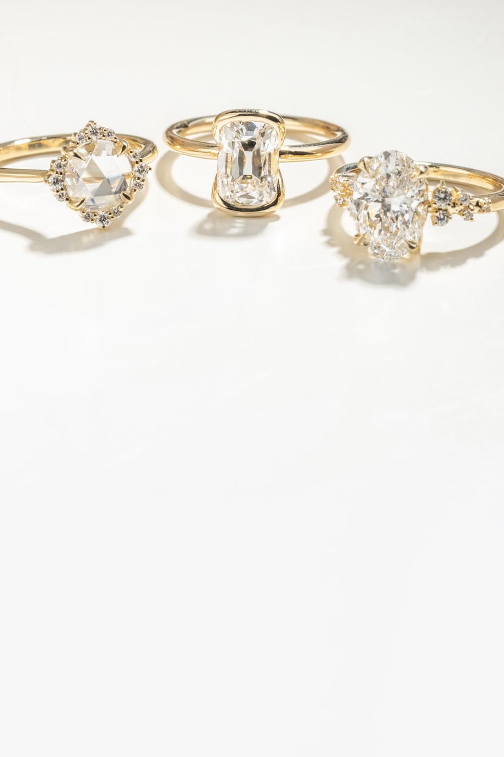 The collection you see here includes round solitaires like the Serena, antique-inspired cushion cuts such as the Rey, and sleek emerald-cut designs set in 14k gold. Some are handcrafted to order, while others are available ready to ship.