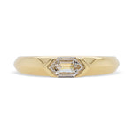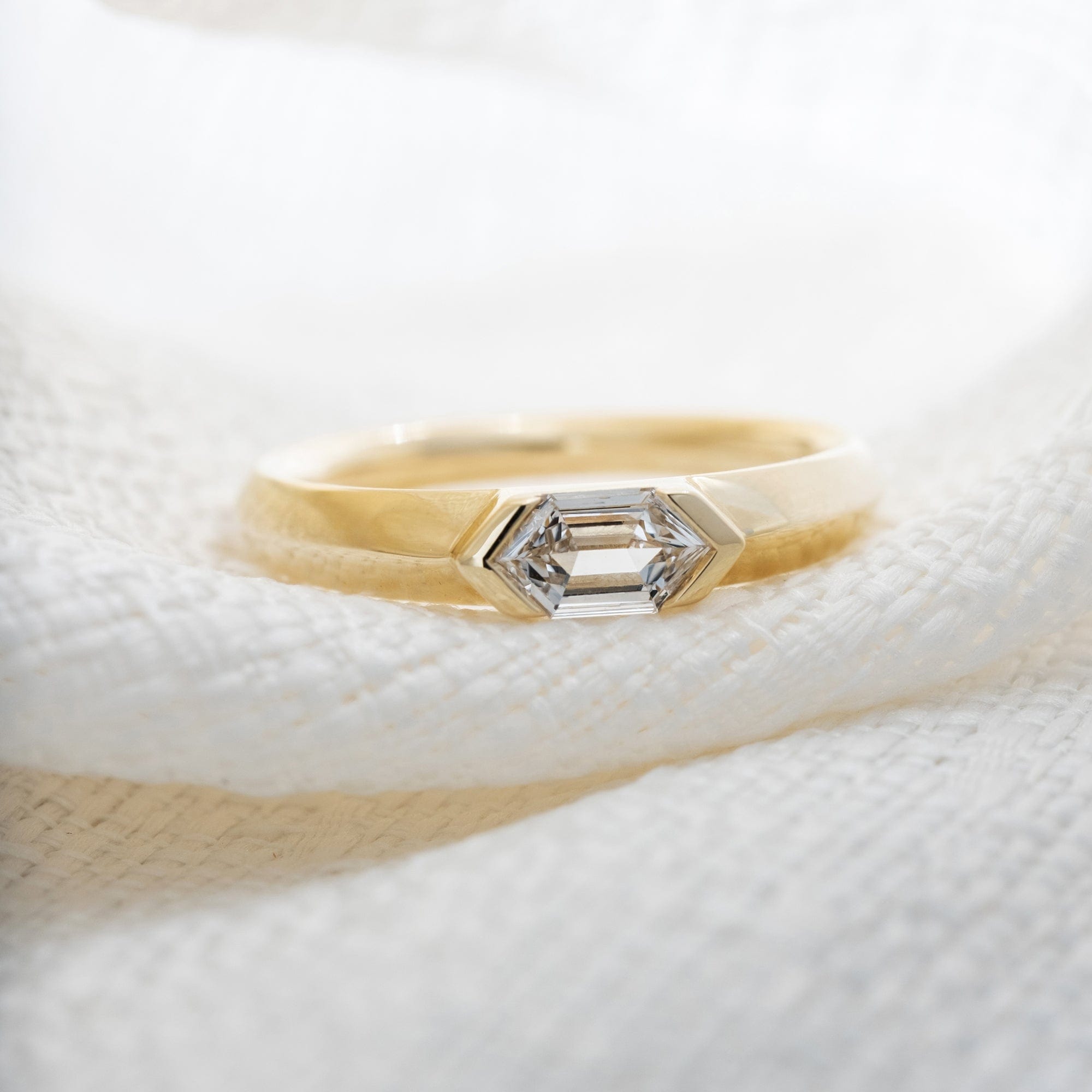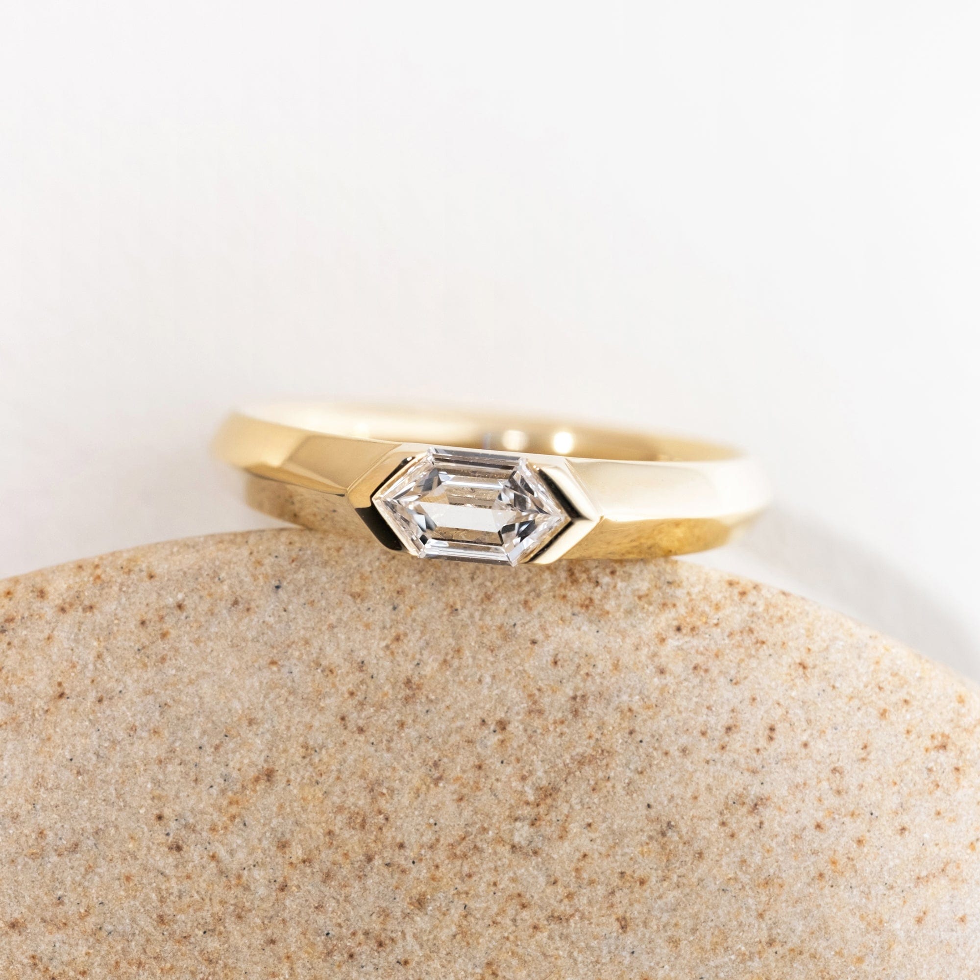 A modern unisex engagement ring featuring a hexagon-cut natural diamond, flush-set in polished gold. Sleek, architectural, and made for any hand.