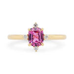 This ring centers on a vibrant cushion pink sapphire, framed by compass of sparkling white diamonds that enhance its depth and color. Set in warm yellow gold, the design strikes a balance between classic structure and bold color, making it a standout piece with refined character.
