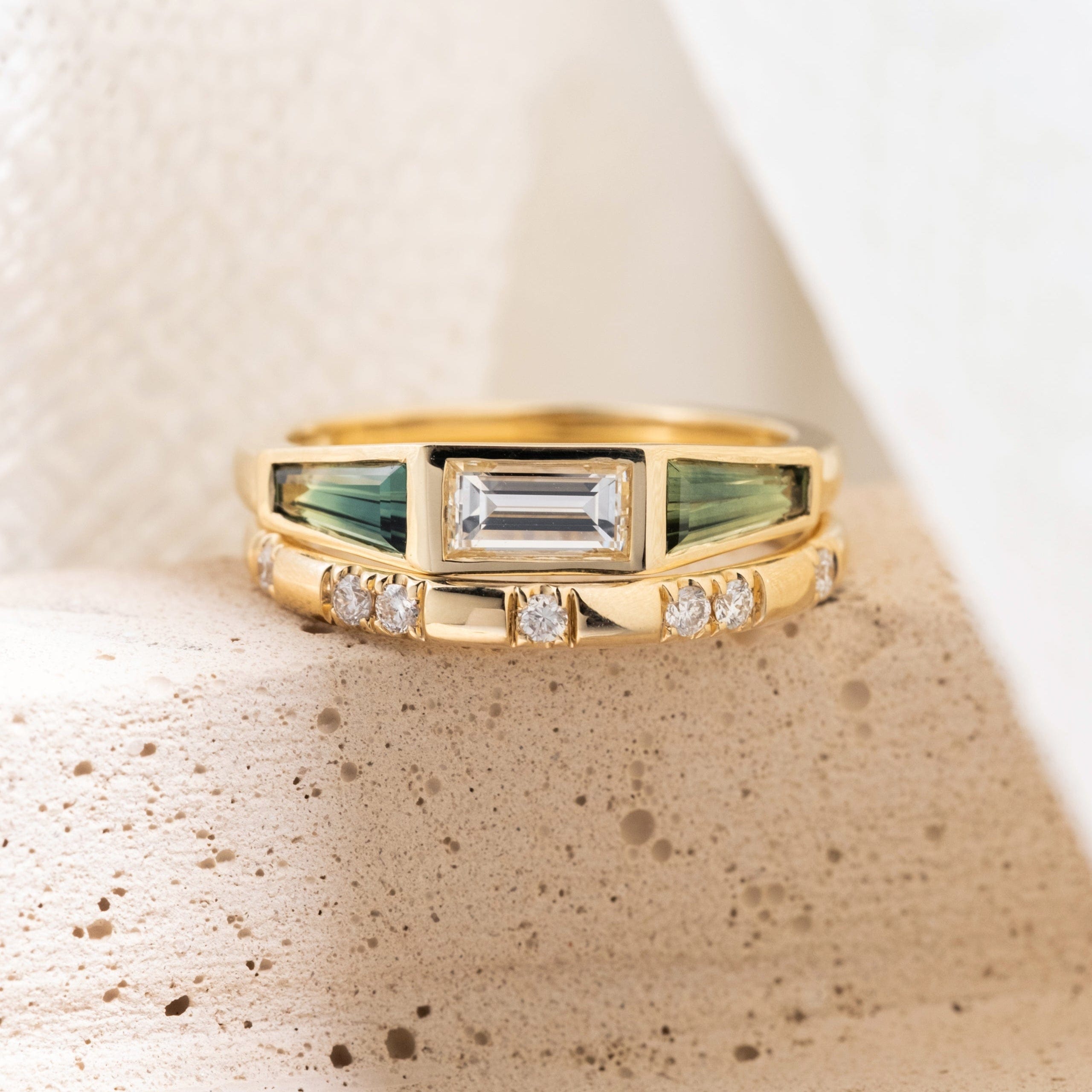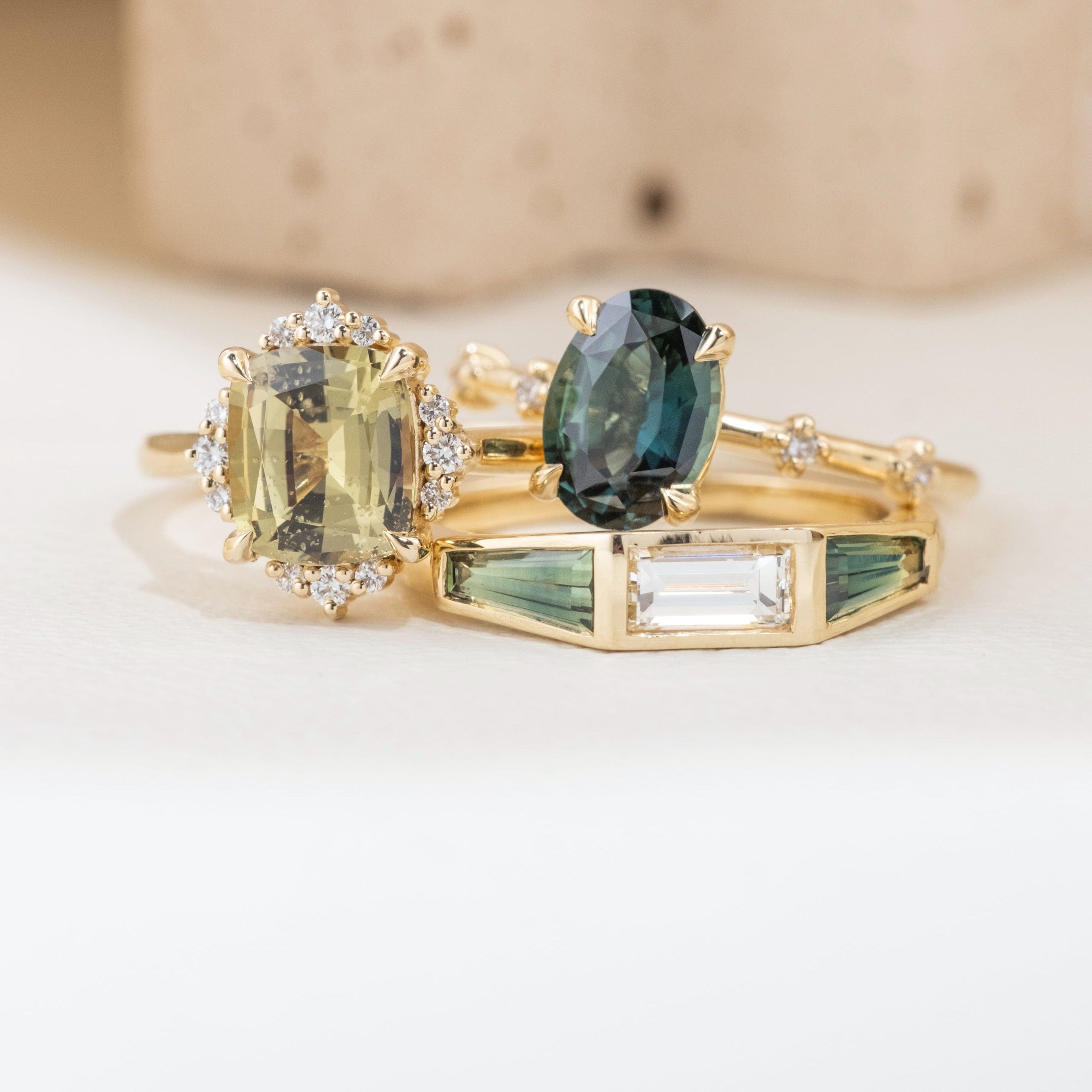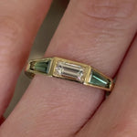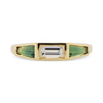 This elegant Art Deco-inspired ring features a striking baguette-cut diamond at its center, flanked by tapered Australian sapphires in rich green hues. Set in a polished yellow gold band, the geometric design highlights a balance of bold color and refined sparkle, perfect for a distinctive and timeless look.